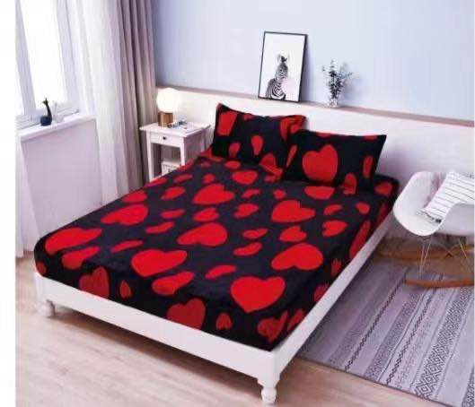 Cearsaf cu Elastic Cocolino 180x200cm si 2 fete de perna 50x70cm, Negru, Inimioare Rosii