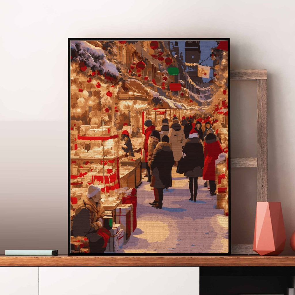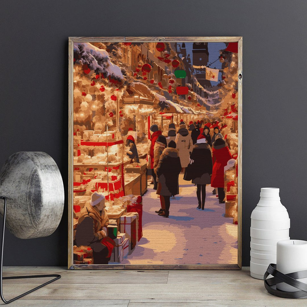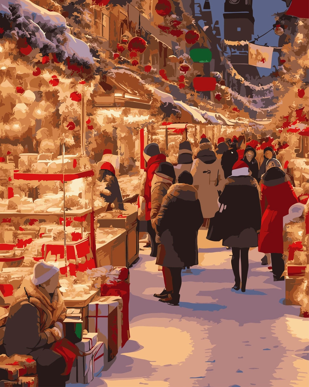 Forfota de sărbători, târgurile de Crăciun, toată această atmosferă este redată în pictura pe numere Christmas fair. Un tablou feeric, a zăpezii care îmbracă orașul.