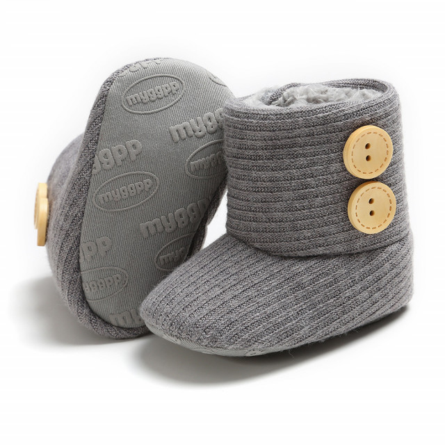 Marimi: 3-6 luni (lungime talpita la interior 10,5 cm, exterior 11 cm) 6-9 luni (lungime talpita la interior 11,5 cm, exterior 12 cm) 9-12 luni (lungime talpita la interior 12,5 cm, exterior 13 cm) Cizmulite pentru fetite imblanite, din material textil, cu doi nasturei aplicati intr-o parte. Se inchid cu arici intr-o parte facilitand incaltarea cu usurinta. Culoare: gri Talpa este din material textil cu inscriptie antiderapanta.