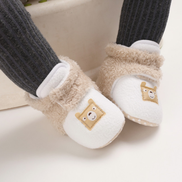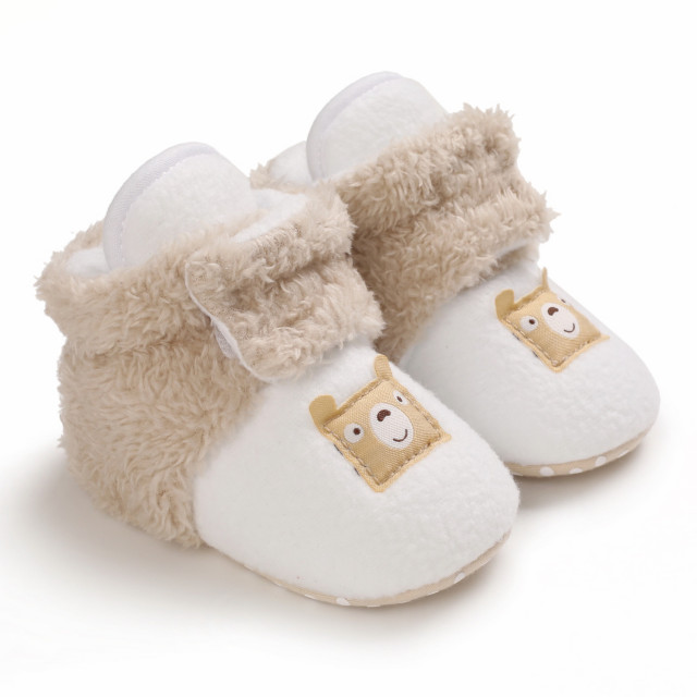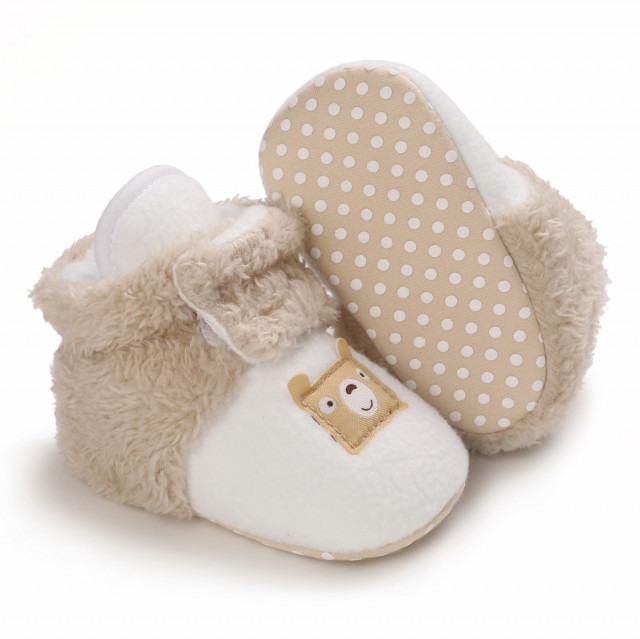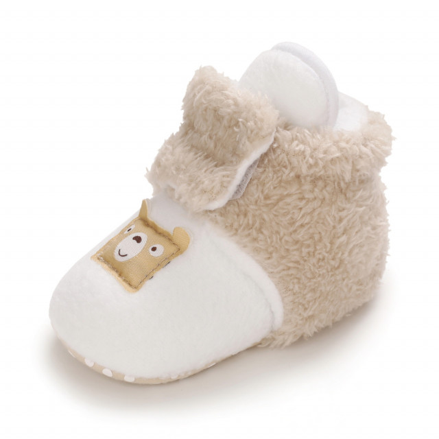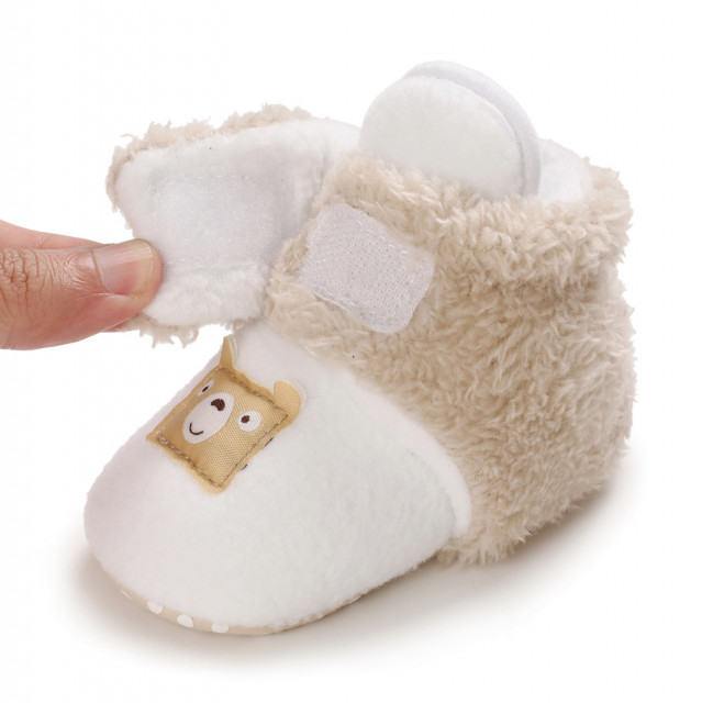 Marimi: 3-6 luni (lungime talpita la interior 10,5 cm, exterior 11 cm) 6-9 luni (lungime talpita la interior 11,5 cm, exterior 12 cm) 9-12 luni (lungime talpita la interior 12,5 cm, exterior 13 cm) Cizmulite pentru bebelusi, din material plusat, imblanite, se inchid cu bareta lata cu arici si sunt prevazute cu un ursulet aplicat in fata. Culoare: alb cu crem Talpa este din material textil cu inscriptie antiderapanta.