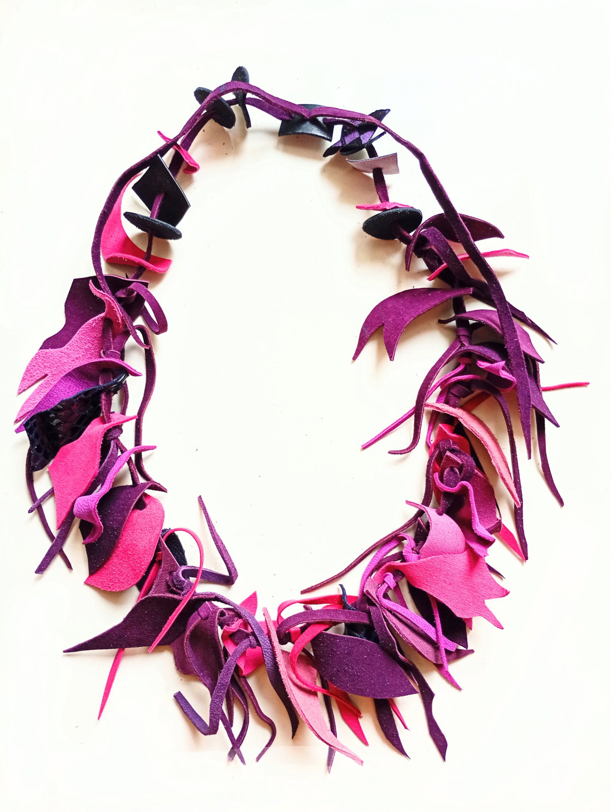 Colier bogat, decorativ, din 6 siruri inegale cu elemente de lemn colorate in auriu si fucsia cu aspect mat. In partea de sus se continua cu 4 snururi din piele ecologica si elemente de inchidere din metal auriu. Descriere dimensiuni: lungimea sirului cel mai scurt 56 cm, lantisor prelungitor 7 cm. Nuantele pot varia usor in realitate, in functie de lumina si setarile fiecarui ecran.