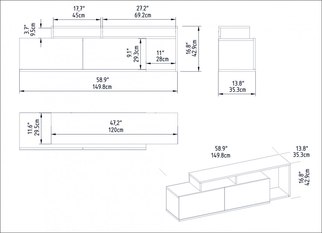 100% PAL LaminatGrosime: 18 mmLatime: 149,8 cm Inaltime: 42,9 cm Adâncime: 35,3 cmNumeroase rafturiPoate fi fixate pe pereteleNumar pachete: 1Dimensiune Pachet: 40x131x12 cm Greutate totala mobilier: 27.1 kg