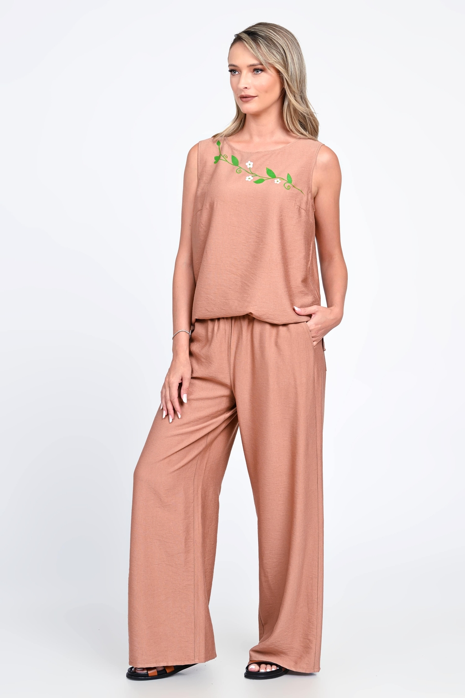 Acest set lejer și elegant este compus dintr-o bluză fără mâneci, cu croială relaxată, și pantaloni largi cu talie elastică, ce oferă libertate de mișcare și confort pe tot parcursul zilei. Designul este completat de buzunare laterale și un buzunar la spate, ideale pentru un plus de funcționalitate. Fabricat dintr-un amestec plăcut de 80% vâscoză și 20% poliamidă, setul este perfect pentru zilele calde, oferind lejeritate și respirabilitate. Culoarea caramel este îmbogățită cu pictură manuală, ceea ce face ca fiecare piesă să fie unică și specială. Ideal pentru ținute casual de vară, ieșiri în oraș sau vacanțe relaxante. Creat cu grijă într-un atelier de creație din România, acest produs este semnat de un designer local sub brandul Eranthe și realizat într-o serie foarte limitată. Fiecare exemplar reflectă atenția pentru detalii, și dorința de a oferi ceva cu adevărat special – o piesă care spune o poveste autentică și care nu se regăsește în producția de masă.
