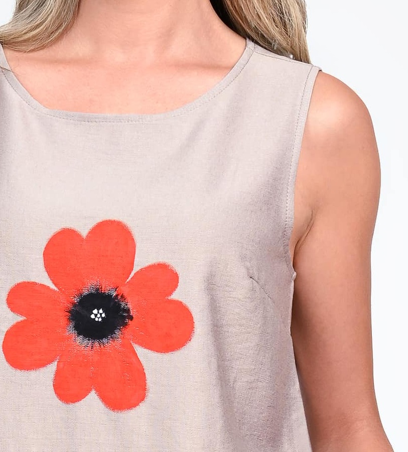 Acest set casual și modern este format dintr-o bluză fără mâneci, cu croi lejer, și pantaloni largi 3/4 cu talie elastică, oferind lejeritate și confort în zilele călduroase. Designul este aerisit și versatil, potrivit pentru activități de zi cu zi sau plimbări relaxante. Materialul din 80% vâscoză și 20% poliamidă este moale, ușor și respirabil. Culoarea bej taupe, îmbogățită cu pictură manuală, oferă o notă caldă, naturală și elegantă, ideală pentru o ținută de vară rafinată. Un set practic și chic, ideal pentru femeia modernă care apreciază confortul cu stil. Creat cu grijă într-un atelier de creație din România, acest produs este semnat de un designer local sub brandul Eranthe și realizat într-o serie foarte limitată. Fiecare exemplar reflectă atenția pentru detalii, și dorința de a oferi ceva cu adevărat special – o piesă care spune o poveste autentică și care nu se regăsește în producția de masă.