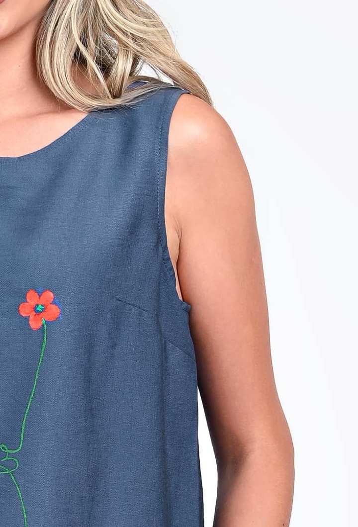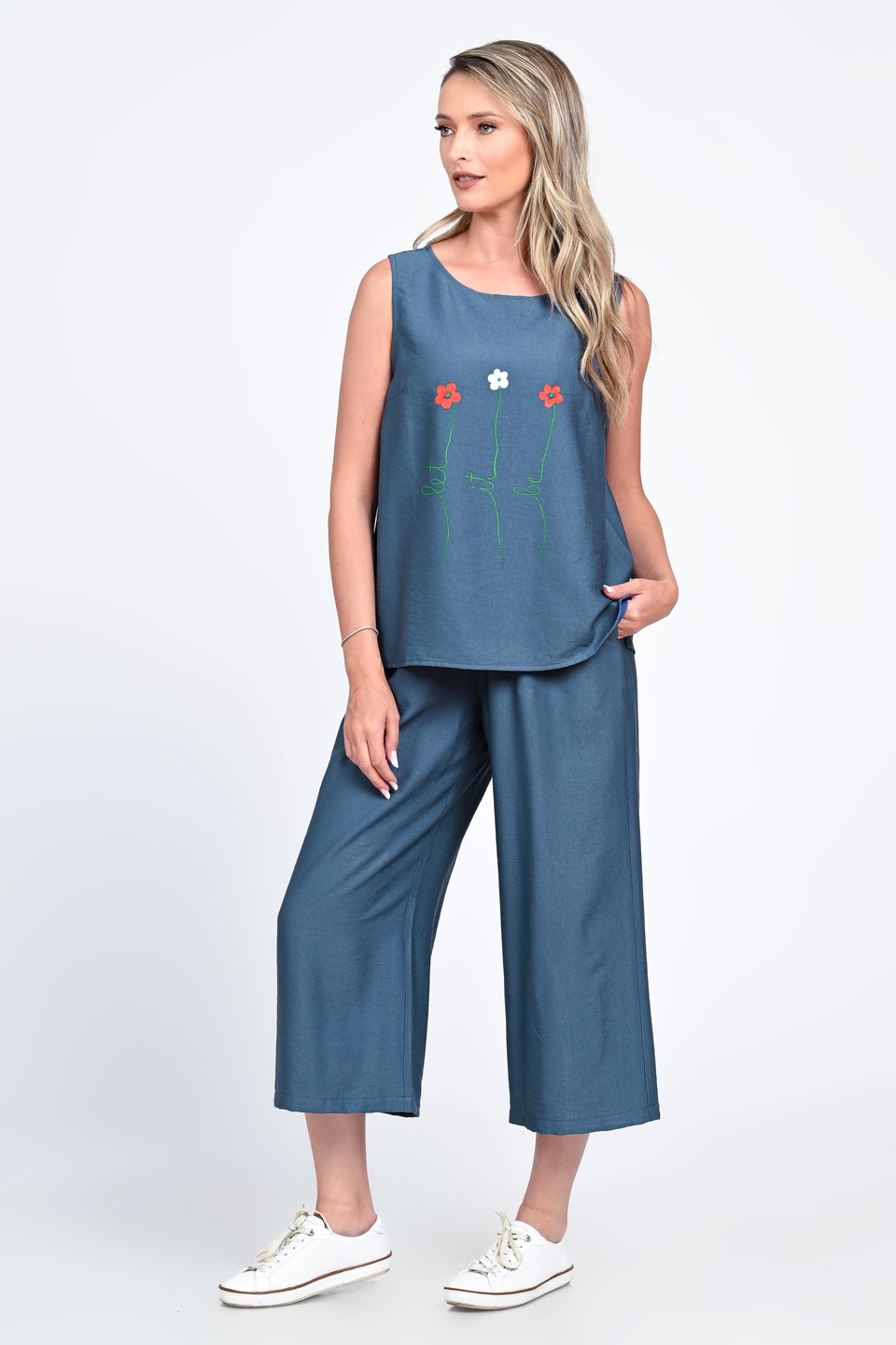 Acest set versatil este compus dintr-o bluză fără mâneci cu croi lejer și pantaloni largi 3/4 cu talie elastică, oferind libertate de mișcare și un look relaxat. Ideal pentru zilele călduroase, acest model îmbină confortul cu stilul casual modern. Realizat dintr-un amestec de 80% vâscoză și 20% poliamidă, setul este ușor, respirabil și moale la atingere. Culoarea albastru denim, îmbogățită cu pictură manuală, adaugă originalitate și un aer artistic fiecărei piese. Potrivit pentru plimbări, ieșiri în oraș sau vacanțe, acest set este o alegere inspirată pentru o ținută relaxată dar de efect. Creat cu grijă într-un atelier de creație din România, acest produs este semnat de un designer local sub brandul Eranthe și realizat într-o serie foarte limitată. Fiecare exemplar reflectă atenția pentru detalii, și dorința de a oferi ceva cu adevărat special – o piesă care spune o poveste autentică și care nu se regăsește în producția de masă.