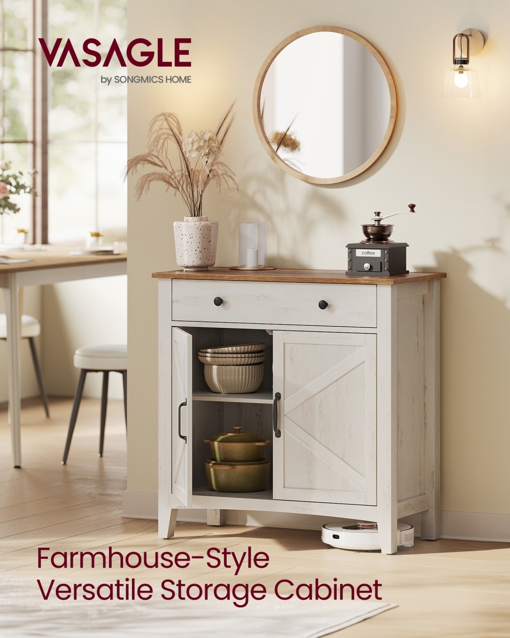Specificații: Culoare: Alb rustic, Maro miere Material: MDF (PAL cu densitate medie), PAL, Oțel Dimensiuni produs: 40 x 80 x 80 cm A x 80 cm L x 80 cm Î Greutate produs: 25,7 kg Capacitate maximă de încărcare statică a blatului: 75 kg Capacitate maximă de încărcare statică a sertarului: 9,1 kg Capacitate maximă de încărcare statică a raftului reglabil: 22,7 kg Conținut pachet 1 x Bufet 1 x Kit accesorii 1 x Kit anti-răsturnare 1 x Instrucțiuni