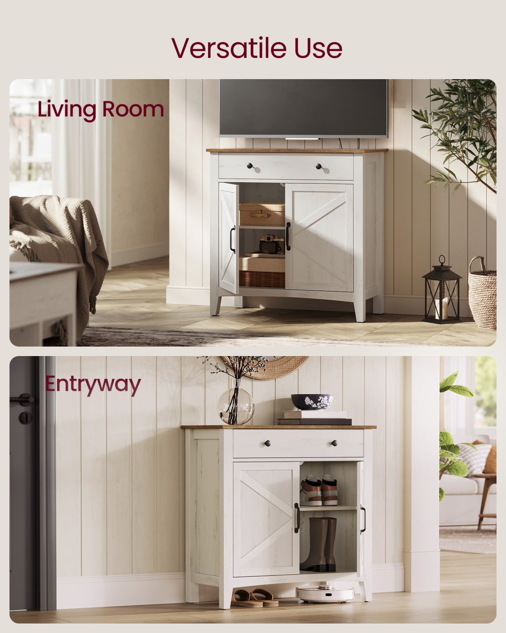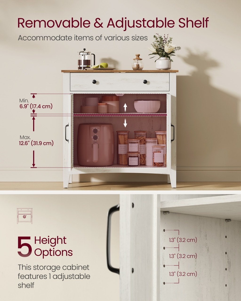 Specificații: Culoare: Alb rustic, Maro miere Material: MDF (PAL cu densitate medie), PAL, Oțel Dimensiuni produs: 40 x 80 x 80 cm A x 80 cm L x 80 cm Î Greutate produs: 25,7 kg Capacitate maximă de încărcare statică a blatului: 75 kg Capacitate maximă de încărcare statică a sertarului: 9,1 kg Capacitate maximă de încărcare statică a raftului reglabil: 22,7 kg Conținut pachet 1 x Bufet 1 x Kit accesorii 1 x Kit anti-răsturnare 1 x Instrucțiuni
