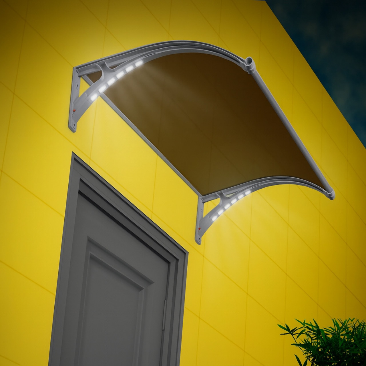 Oferi protectie si iluminare inteligenta intrarii tale cu aceasta copertina premium de 100x120 cm, prevazuta cu panou solar de clasa A si senzor de miscare. Realizata din policarbonat celular de 5.2 mm, copertina este rezistenta la raze UV, ploaie si variatii de temperatura, pastrandu-si aspectul modern si elegant. Structura este sustinuta de brate laterale din ABS si bare din aluminiu, asigurand stabilitate si durabilitate in timp. Sistemul solar permite functionare complet autonoma: panoul solar incarca bateria in timpul zilei, iar iluminarea se activeaza automat datorita senzorului de lumina si senzorului de miscare, care detecteaza prezenta pe un unghi larg. Este ideala pentru usi de intrare, ferestre, terase sau zone comerciale. Designul modular permite montarea mai multor copertine una langa alta pentru protectie extinsa. Instalarea este rapida, cu toate accesoriile incluse. Date tehnice Adancime: 100 cm Latime: 120 cm Inaltime: 27 cm Material acoperis: policarbonat celular 5.2 mm, rezistent la UV Material brate: plastic ABS Panou solar: Clasa A, 3W Mod functionare: control lumina + senzor de miscare Unghi detectare: 120° Distanta detectare: 4–7 m Durata functionare: pana la 5 zile (in functie de incarcare) Timp incarcare: aproximativ 8 ore la soare Protectie apa: IP55 Greutate: 5.65 kg Recomandare: nu se utilizeaza in zone cu ninsori abundente