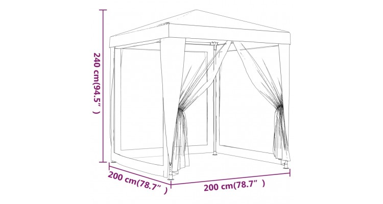 Specificatii Culoare: Albastru Material: HDPE cu acoperire (polietilena de inalta densitate), fier vopsit electrostatic Dimensiuni: 200 x 200 x 240 cm (L x l x i) Inaltime de la sol la streasina: 2 m Rezistent la raze UV Rezistent la apa 4 pereti laterali din plasa, o parte are fermoar pentru intrare Pachetul de livrare contine: 1 x Cort 1 x Franghie 8 x Tarus Acest cort de petrecere, cu un cadru din otel vopsit electrostatic, un acoperis rezistent la apa si patru pereti laterali din plasa, este un adapost ideal impotriva soarelui. Material premium: Acest foisor este fabricat din polietilena de inalta densitate (HDPE) care va protejeaza de lumina directa a soarelui si permite suficient vant. HDPE este tratat special, deci este si rezistent la apa. Cadru de fier: Cadrul de fier al acestui pavilion asigura robustete si stabilitate. Design practic: Cortul are patru pereti laterali din plasa, care va protejeaza de insectele deranjante. Iar unul dintre peretii laterali are fermoar pentru intrare si acces usor. Aplicatii vaste: Acest cort pentru evenimente este o alegere ideala pentru o gama larga de evenimente in aer liber, cum ar fi spectacole, nunti, petreceri, gratar, festivaluri si asa mai departe. Nota: Acest produs nu trebuie NICIODATA folosit in conditii de vreme rea, precum vanturi puternice, ploi abundente, zapada, furtuna etc. Fiecare produs vine cu un manual de asamblare in cutie, pentru asamblare usoara.
