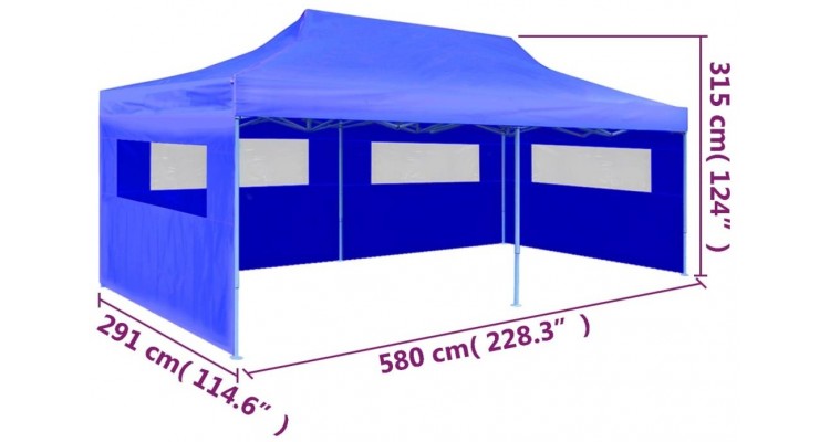 Acest cort de petrecere/pavilion pliabil va fi o solutie ideala atat pentru uz comercial, cat si pentru uz personal Este potrivit pentru petreceri, gratare, piete, evenimente sportive, camping, vanzari in curte, evenimente scolare si targuri. Acoperisul din material oxford impermeabil cu invelis din PVC asigura o flexibilitate maxima, rezistenta la intemperii si protectie UV. Pentru a asigura o protectie completa, peretele nostru poate acoperi atat laturile mici, cat si partea din spate. Este foarte usor de montat, putand fi inaltat sau pliat in doar cateva minute. Materialul textil poate fi fixat pe cadru cu franghii (franghiile sunt incluse in pachetul de livrare). Datorita legaturilor rezistente, stabilitatea acestuia este asigurata. Stalpii si barele metalice robuste sunt fabricate din otel vopsit electrostatic, asigurandu-i o durata lunga de viata. Este usor de asamblat. NOTA: Acest produs nu trebuie folosit NICIODATA in conditii de vreme rea, precum vant puternic, ploaie abundenta, zapada, furtuna etc. Specificatii Culoare: Albastru Material cadru: Otel vopsit electrostatic Material acoperis: Poliester 220 g/m² cu invelis din PVC (100% impermeabil) Dimensiuni: 580 x 291 x 315 cm (L x l x i) Inaltime picior lateral: 2,35 m 1 perete lateral cu 4 ferestre din PVC Pachetul de livrare include: 6 x franghie si 12 x cui. Este foarte usor de asamblat Material: Poliester: 100%