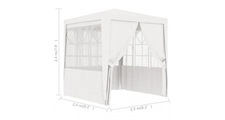 Specificatii Culoare: Alb Material: 90 g/m² PE (polietilena 100%), otel Dimensiuni: 2,5 x 2,5 x 2,4 m (L x l x i) Inaltime de la sol la streasina: 2 m Cu pereti laterali Rezistent la apa si la raze UV Materiale de montaj incluse: Da Cortul de petrecere ofera un spatiu minunat in care sa va distrati alaturi de familie si prieteni la o varietate de petreceri si reuniuni in aer liber. Cortul de gradina este realizat din polietilena rezistenta la apa si raze UV, fiind foarte practic pentru utilizarea in exterior. Cadrul este fabricat din otel rezistent la rugina, asigurand stabilitate si durabilitate copertinei de exterior. Cortul de petreceri este prevazut cu panouri laterale, fiecare cu ferestre decorative, si cu o usa cu fermoar, pentru acces usor. Cortul de gradina este usor de asamblat. NOTA: Acest produs nu trebuie folosit NICIODATA in conditii de vreme rea, precum vant puternic, ploaie abundenta, zapada, furtuna etc.