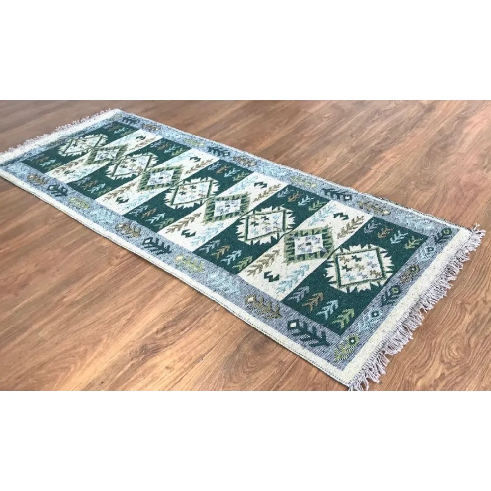 Un covor tradițional românesc este o piesă decorativă și practică, lucrată manual din materiale naturale, cum ar fi lâna, bumbacul sau inul, și vopsită cu culori naturale. De obicei, este realizat în culori vii, predominând nuanțe de roșu, albastru, verde, galben și alb, care au semnificații culturale și simbolice. Modelele tradiționale includ motive geometrice, florale, animale sau elemente inspirate din natură, cum ar fi soarele, frunza, spirala sau valurile apei, fiecare având o simbolistică aparte. Covorul tradițional este, de asemenea, caracterizat printr-o simetrie atentă, care reflectă armonia și echilibrul pe care oamenii le căutau în viața de zi cu zi. Țeserea unui covor tradițional necesită multă îndemânare și experiență, fiind transmisă de obicei din generație în generație, iar fiecare covor este unic, având mici variații care îl fac special. Aceste covoare sunt folosite pentru decorarea casei, având atât un rol estetic, cât și unul practic de izolare termică, fiind așezate pe podea sau chiar pe pereți, în special în regiunile rurale. Dimensiune: 60 x 90 cm Compozitie: Bumbac&Lana&Iuta Intretinere: Se poate spala la masina de spalat la 40 grade Atentie! Pozele sunt de prezentare! Culorile digitale pot fi mai intense decat in realitate!