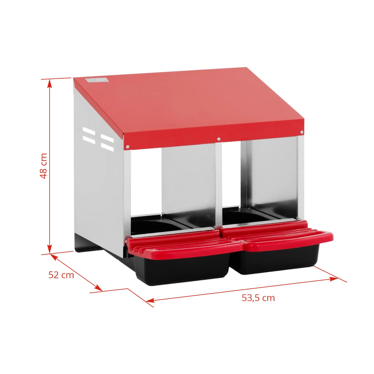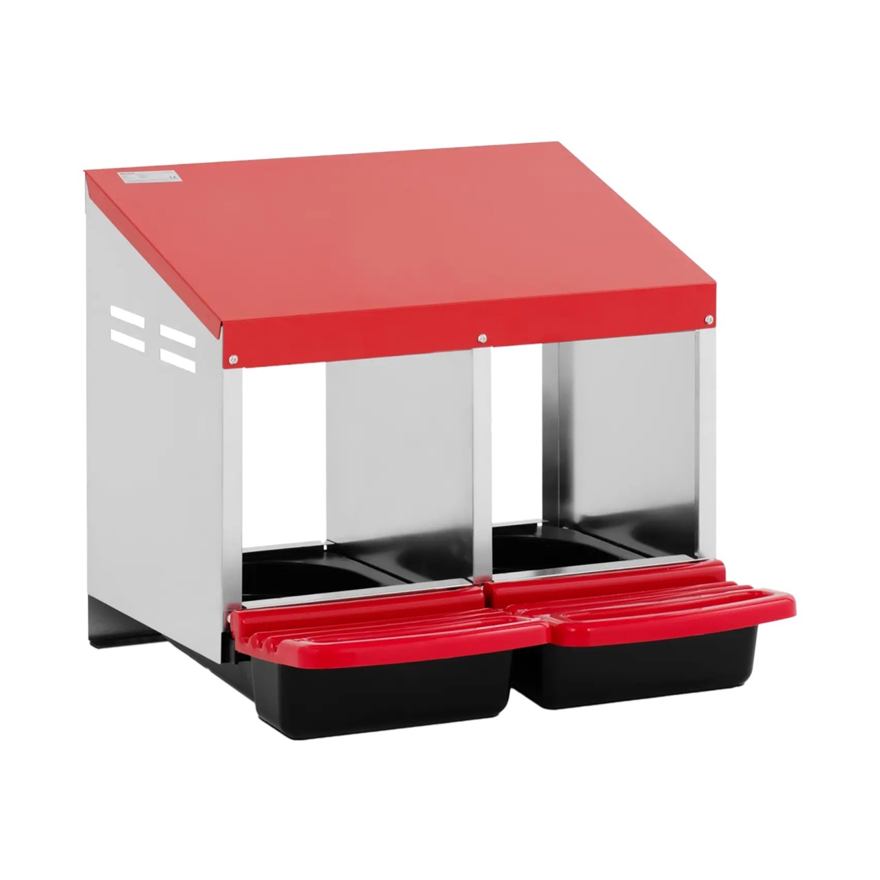 Cuibarul cu 2 compartimente este o solutie compacta si eficienta pentru colectarea oualor in conditii igienice si sigure. Perfect pentru gospodarii mici sau adaposturi de pasari cu spatiu redus, acest cuibar este construit din otel galvanizat durabil , oferind o protectie excelenta impotriva coroziunii si uzurii. ✔️ Colectare automata – ouale se rostogolesc usor in tavitele de colectare datorita bazei inclinate. ✔️ Protectie sporita – gainile nu au acces la oua dupa depunere, prevenind spargerea sau consumarea acestora. ✔️ Usor de curatat – tavitele din plastic sunt detasabile si lavabile. ✔️ Constructie robusta – pereti, separatoare si acoperis din otel galvanizat pentru rezistenta pe termen lung. ✔️ Design compact – ideal pentru spatii mici sau pentru completarea unui sistem modular cu mai multe cuibare. Dimensiuni produs: ? Latime: 52 cm ? Lungime: 53,5 cm ? Inaltime: 48 cm ⚖️ Greutate: 6,3 kg Un echipament esential pentru crescatorii care doresc eficienta, igiena si durabilitate intr-un format compact.