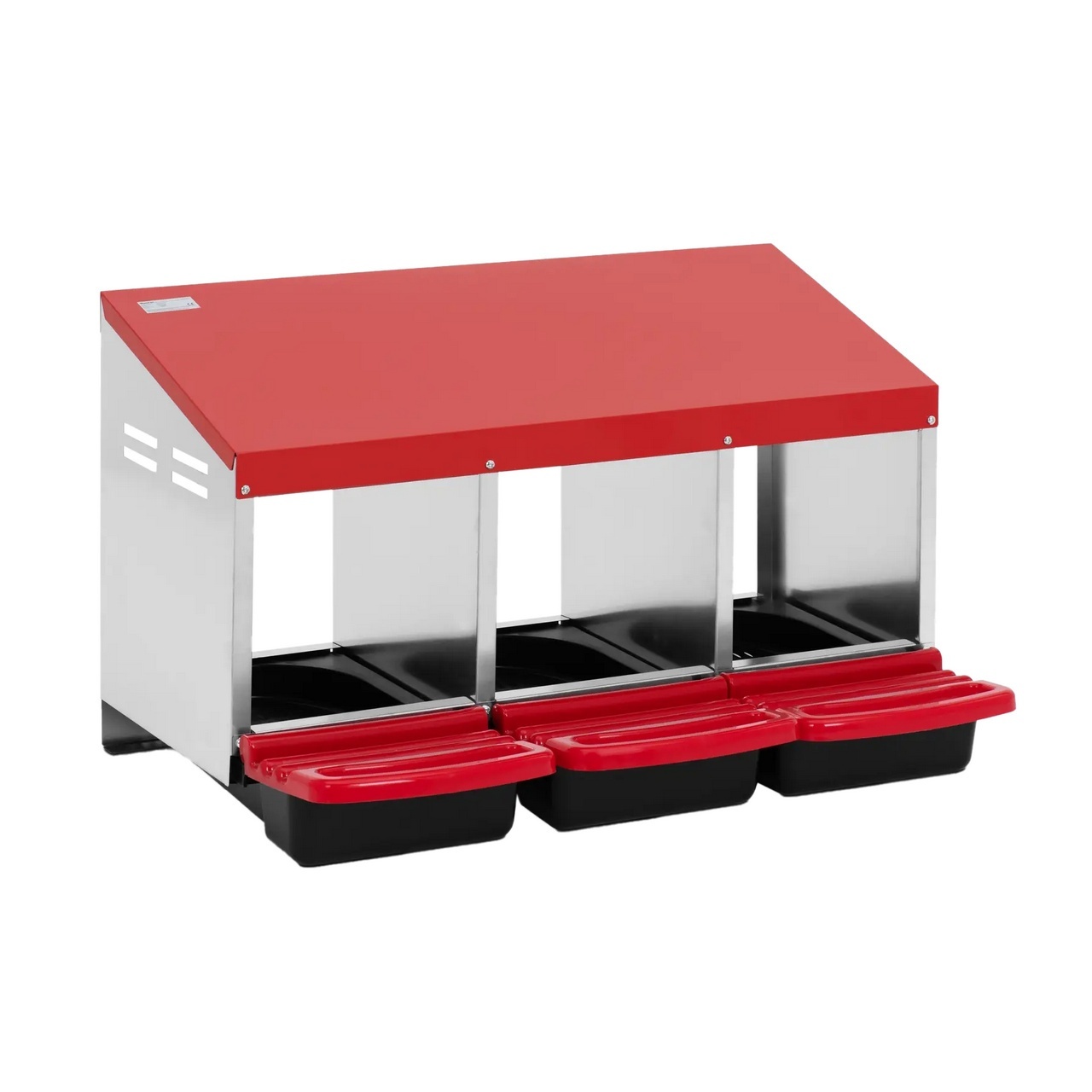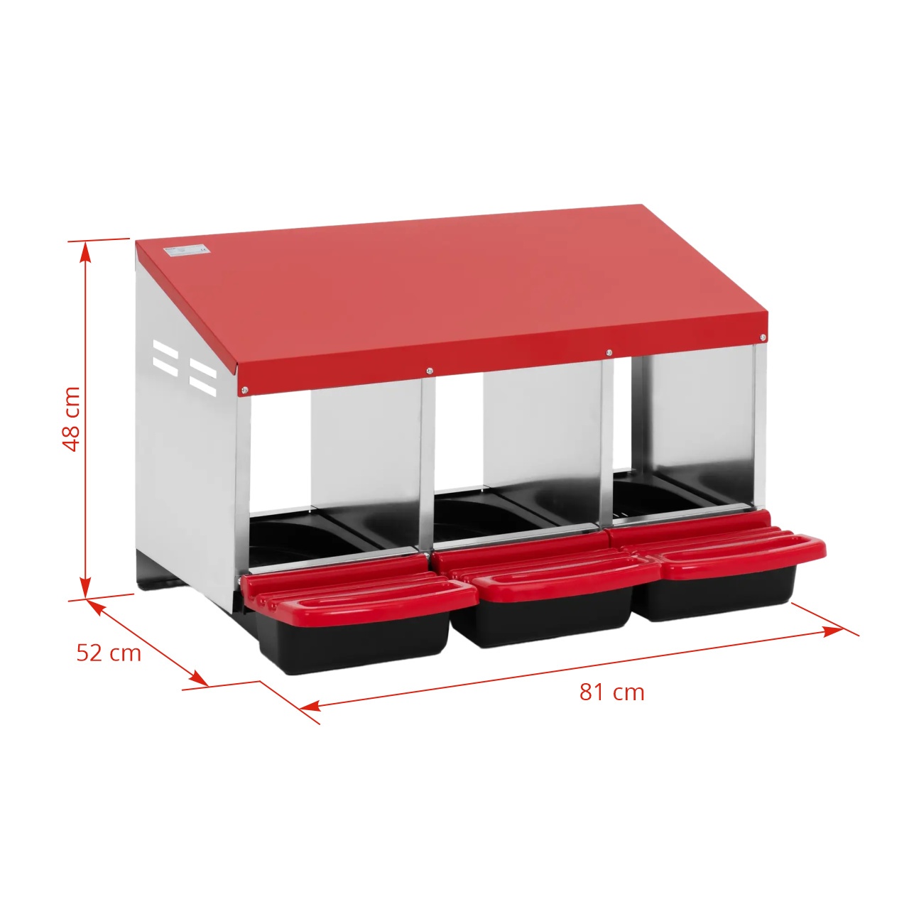 Cuibarul cu 3 compartimente este soluția ideală pentru o colectare curată, eficientă și sigură a ouălor , atât în gospodării, cât și în ferme de dimensiuni reduse. Construit din otel galvanizat rezistent , acest cuibar oferă durabilitate pe termen lung și protecție împotriva coroziunii și uzurii. ✔️ Design eficient – suprafata interioara este usor inclinata, permitand oualor sa se rostogoleasca automat in tavitele de colectare. ✔️ Protectie sporita pentru oua – gainile nu au acces la oua dupa depunere, prevenind spargerea lor. ✔️ Tavite detasabile din plastic – igienice, rezistente si usor de curatat. ✔️ Constructie solida – pereti laterali, separatoare si acoperis din otel galvanizat, pentru utilizare indelungata in orice conditii. ✔️ Compact si usor de montat – ideal pentru amplasare in cotețe, anexe sau adăposturi de pasari. Dimensiuni produs: ? Latime: 52,5 cm ? Lungime: 81 cm ? Inaltime: 48 cm ⚖️ Greutate: 9 kg Un accesoriu esential pentru orice crescatorie de pasari, cuibarul cu 3 compartimente contribuie la mentinerea igienei si creste eficienta in colectarea oualor.