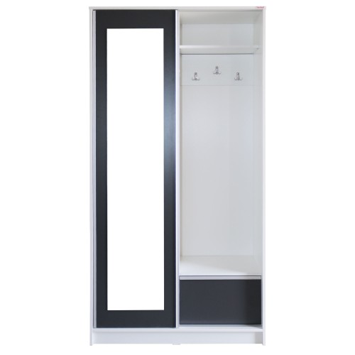 Dimensiuni (l x h x a): 1000 x 1940 x 378 mm Culoare: Alb cu Gri. Descriere: Usa culisanta cu glinda, suport de umerase in spatele usii culisante, manere din profil de aluminiu la usi, usa mica rabatabila cu spatiu de depozitare. Materiale folosite: Carcasa din pal melaminat, profil aluminiu si oglinda. *Nota: Schita de montaj nu se afla in interiorul coletului intre piesele de mobila. Schita de montaj o sa fie atasata pe spatele facturii.