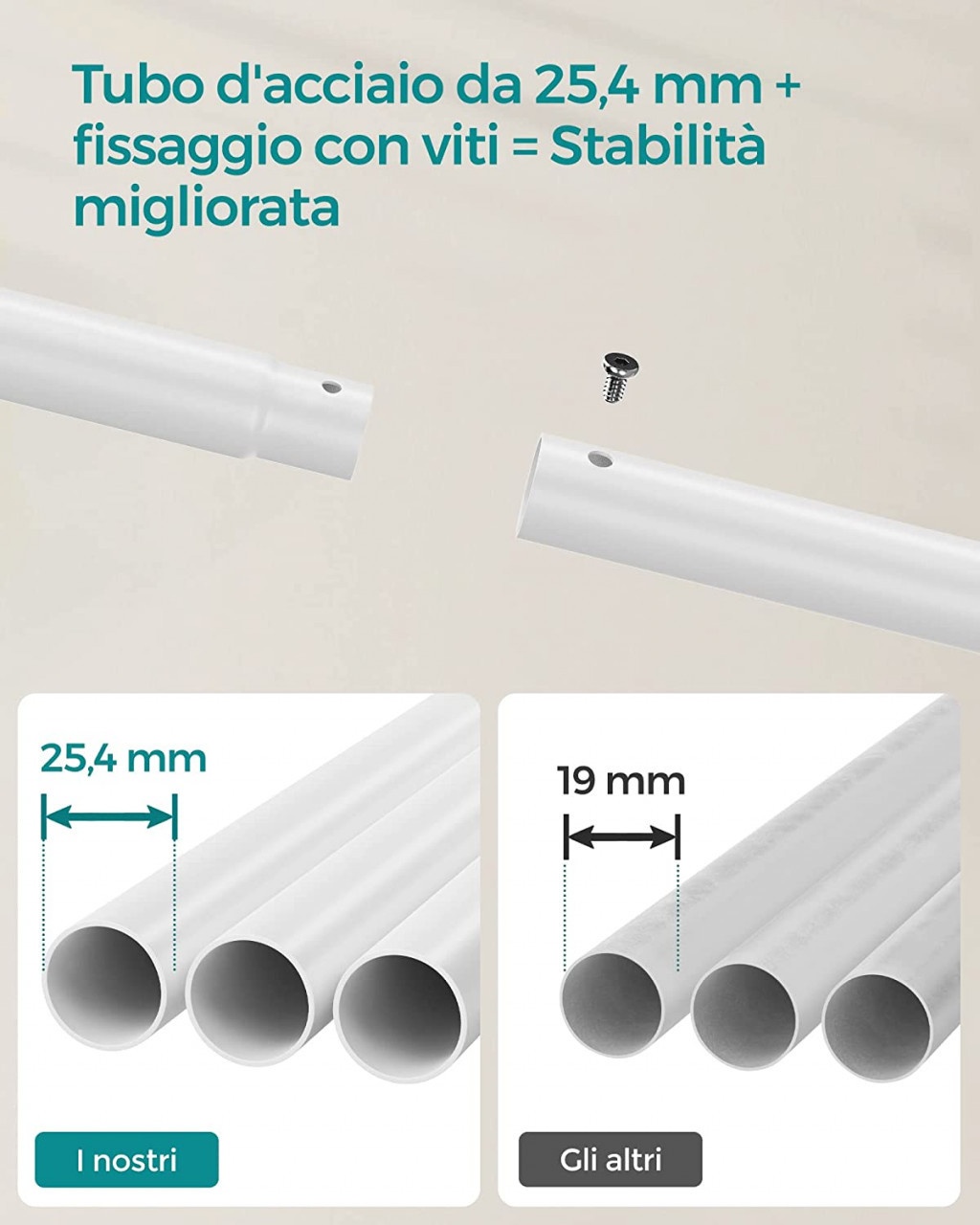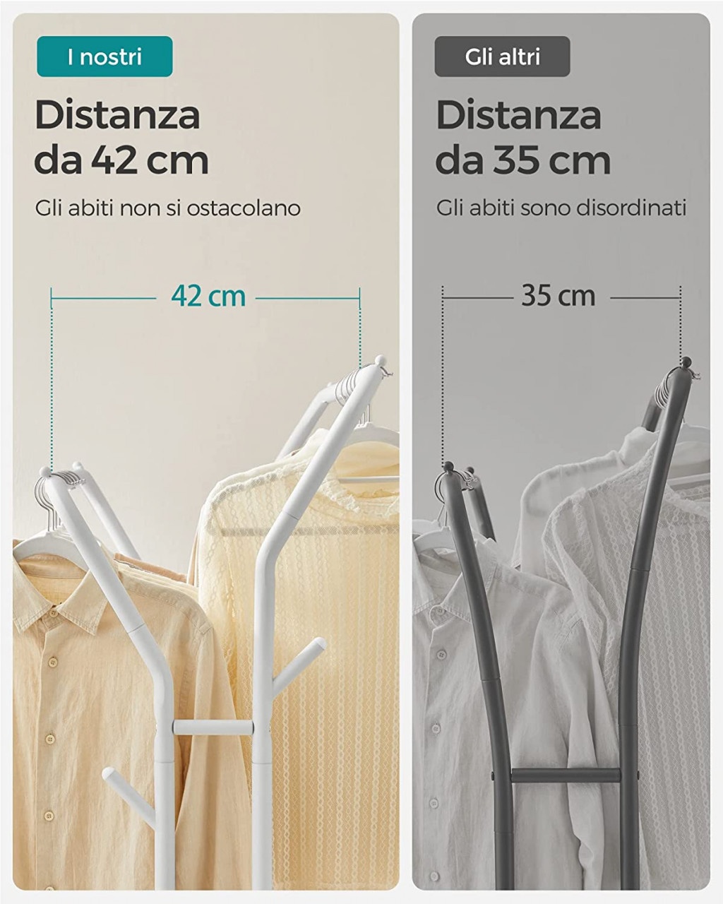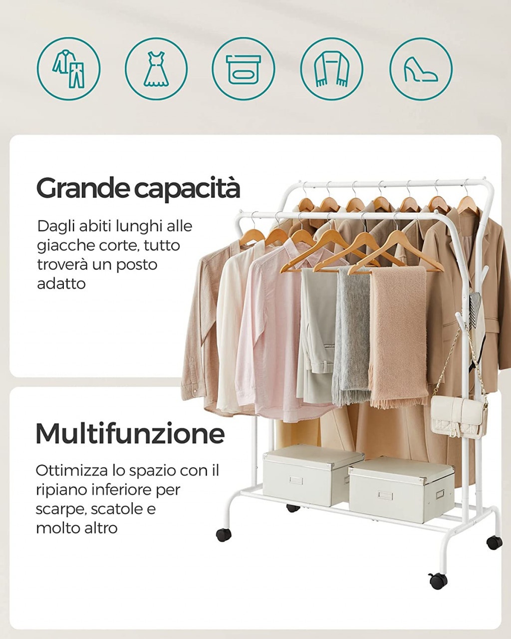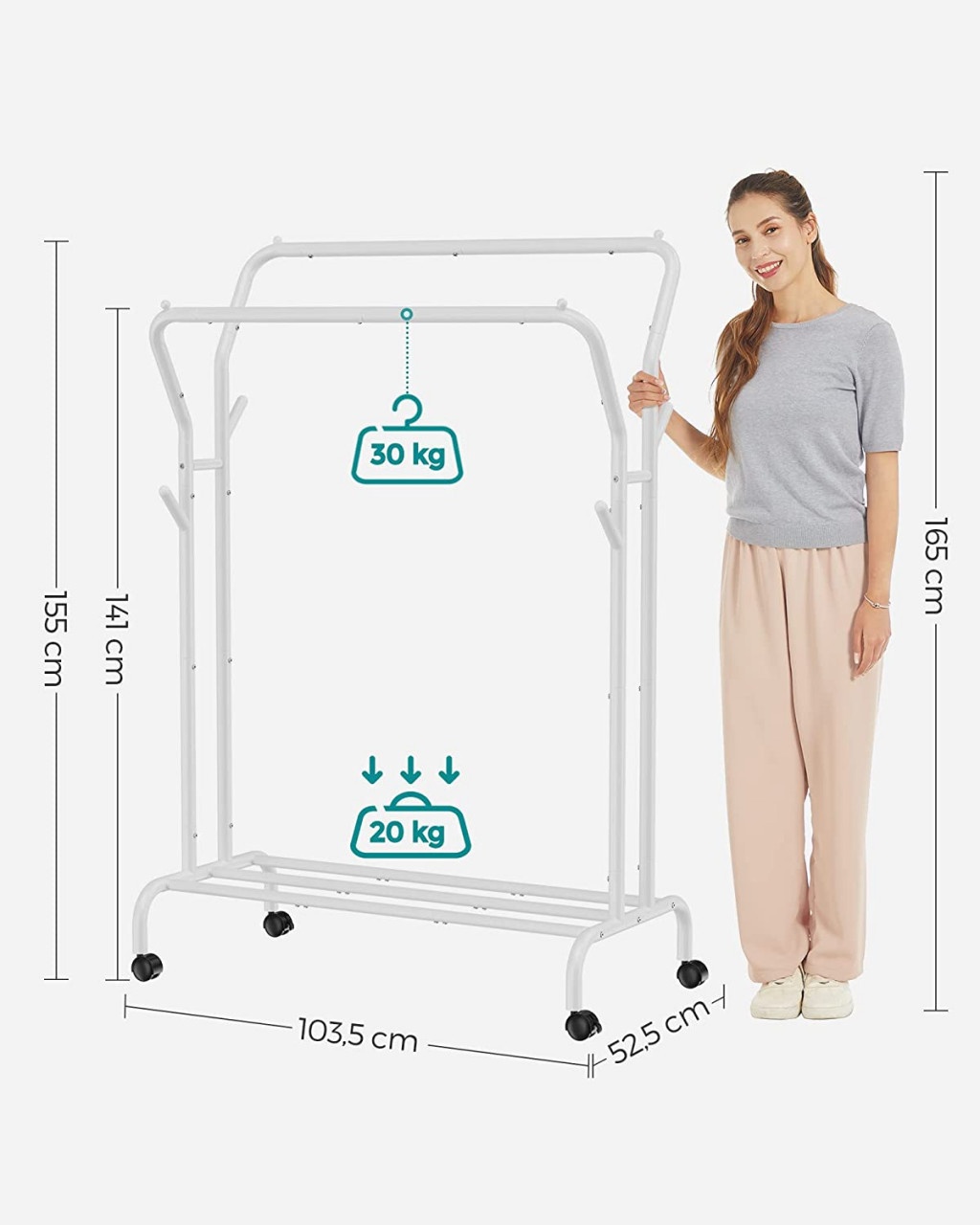 [Depozitare versatila] Cu o sina inalta si o sina joasa pentru agatarea hainelor de diferite lungimi, carlige pe ambele parti pentru genti si palarii si un raft inferior pentru cutii si pantofi, acest suport de haine va pastreaza toate lucrurile esentiale intr-un singur loc.[Uscare rapida si acces usor] Spatiul de 42 cm dintre cele 2 sine de agatat hainele permite aerului sa circule cu usurinta, favorizand uscarea rapida. Ofera o suprafata de agatare ampla pentru a preveni hainele aglomerate si dezordonate, facilitand accesul la acestea[Usor de mutat si de blocat] Glisati fara efort bara dubla pentru haine in orice camera din casa datorita celor 4 roti pivotante. 2 dintre roti pot fi blocate, astfel incat puteti, de asemenea, sa pastrati rastelul intr-un singur loc[Stabil si puternic] Cu suruburi care fixeaza tuburile din otel de 25,4 mm grosime, acest suport pentru haine are un cadru stabil care poate sustine pana la 100 kg. Fiecare sina are o capacitate de incarcare statica maxima de 30 kg; fiecare carlig pana la 5 kg; iar raftul inferior poate sustine pana la 20 kg[Asamblare usoara] Structura sa simpla, piesele numerotate si instructiunile ilustrate usor de citit fac ca montarea acestei sine de rufe rezistente sa fie foarte usoara.