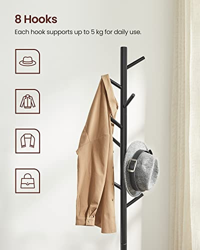 Durabil si revigorant: Fabricat din lemn masiv cu diametrul de 3,8 cm, acest cuier este durabil pentru multi ani de acum incolo. In plus, culoarea neagra adauga o nota revigoranta casei dvs.Inaltime reglabila pentru diferite nevoi: Designul cu 3 sectiuni va permite sa decideti inaltimea cuierului pentru haine. Pentru copii, doar 1-2 sectiuni sunt suficiente; pentru adulti, instalati toate cele 3 sectiuniBaza triunghiulara stabila: Stabilitatea este principala prioritate pentru un cuier. Baza triunghiulara cu latimea de 47 cm ofera o baza solida pentru acest cuier, care poate sustine pana la 15 kg.Economie de spatiu si rezistenta: Acest cuier de 47 x 47 x 175 cm se potriveste chiar si in holurile inguste si suporta o incarcatura grea. Cele 8 carlige (incarcatura de 1,5 kg per carlig) pot fi folosite pentru agatarea hainelor, gentilor si esarfeleAsamblare usoara: Ingrijorat de asamblarea complicata? Relaxati-va. Structura simpla, piesele etichetate si instructiunile usor de urmat va vor ajuta sa terminati asamblarea fara efort.