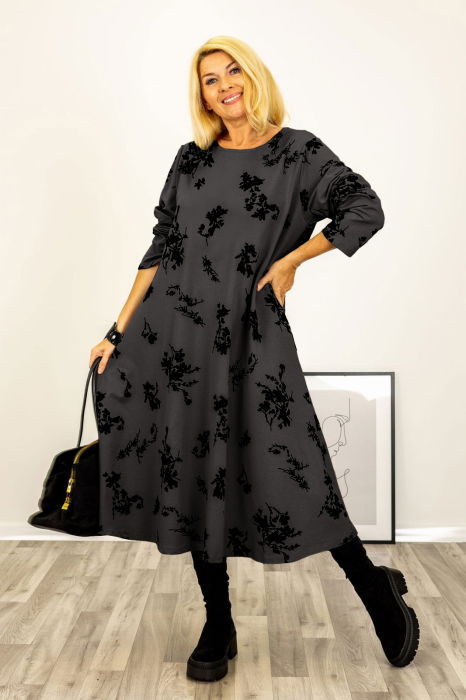 Rochie A-line cu flori embosate si catifelate, din jerseu de bumbac gri inchis