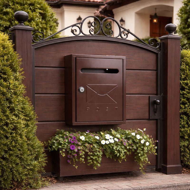 Cutie postala metalica, Maro Dimensiune produs: 26 x 20 x 7.5 cm Pastreaza corespondenta protejata si organizata cu o cutie postala metalica maro, conceputa pentru utilizare la exterior. Constructia din metal rezistent ajuta la protejarea scrisorilor si documentelor impotriva intemperiilor si uzurii zilnice. Designul compact este potrivit pentru casa, apartament sau birou, iar montajul pe perete sau gard permite amplasarea rapida in zona de acces. Fanta pentru scrisori permite introducerea usoara a plicurilor, iar usa frontala cu inchidere asigura acces simplu si sigur la continut, doar pentru proprietar. Cutie postala pentru exterior Material: metal rezistent Culoare: maro Dimensiuni: 260 x 200 x 75 mm Montaj: pe perete sau gard Acces: usa frontala cu inchidere Utilizare: scrisori, plicuri, documente Rezistenta: potrivita pentru utilizare in exterior