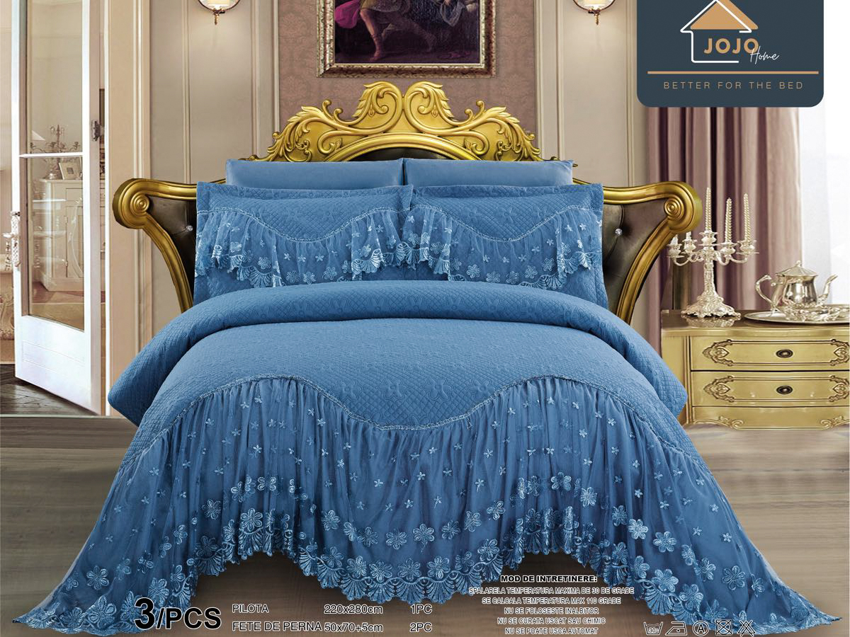 Cuvertura de lux, pentru pat 2 persoane, din bumbac tip finet, cu volanase din voal cu dantela brodata, pentru un plus de eleganta si rafinament. Cuverturile de pat sunt cele mai potrivite pentru anotimpul rece. Totodata, ele adauga mai multa caldura dormitorului tau. Cuvertura este matlasata ultrasonic. Setul vine ambalat in husa transparenta din plastic - poate fi folosita ca husa pentru depozitare sau ca ambalaj pentru a darui celor dragi aceasta minunata cuvertura. Avantajele cuve