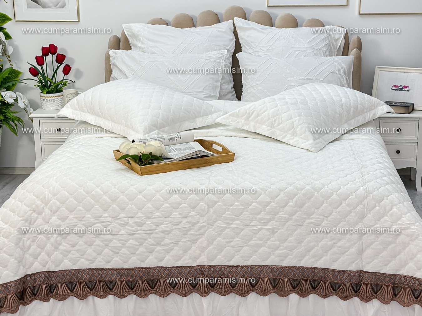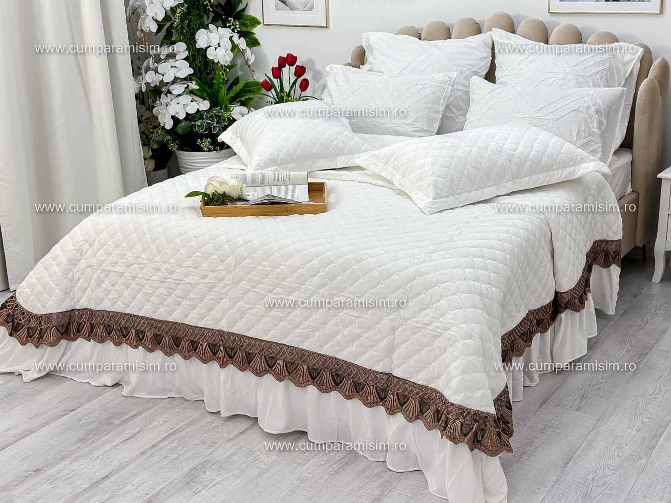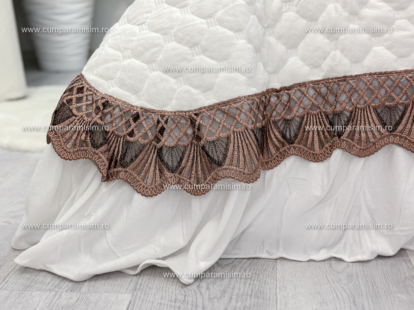 Cuvertura de lux, pentru pat 2 persoane, din catifea, matlasata, cu volanase pe partea de jos, accesorizate cu o eleganta broderie aurier, pentru un plus de eleganta si rafinament. Cuverturile de pat sunt cele mai potrivite pentru anotimpul rece.  Totodata, ele adauga mai multa caldura dormitorului tau. Setul vine ambalat in husa transparenta din plastic - poate fi folosita ca husa pentru depozitare sau ca ambalaj pentru a darui celor dragi aceasta minunata cuvertura. Avantajele cuvert
