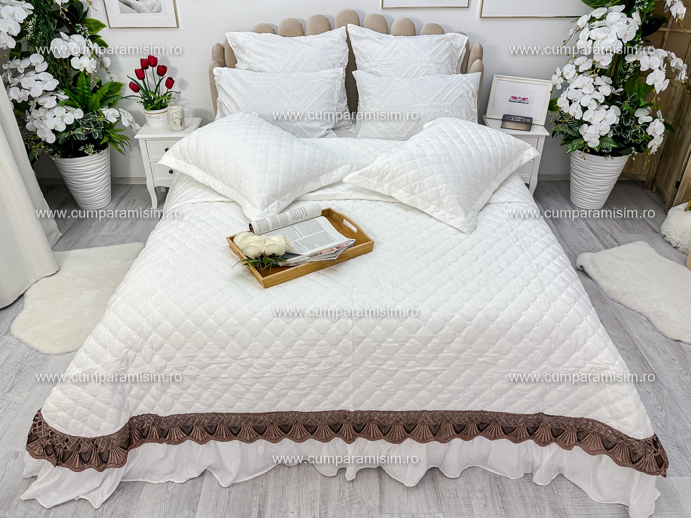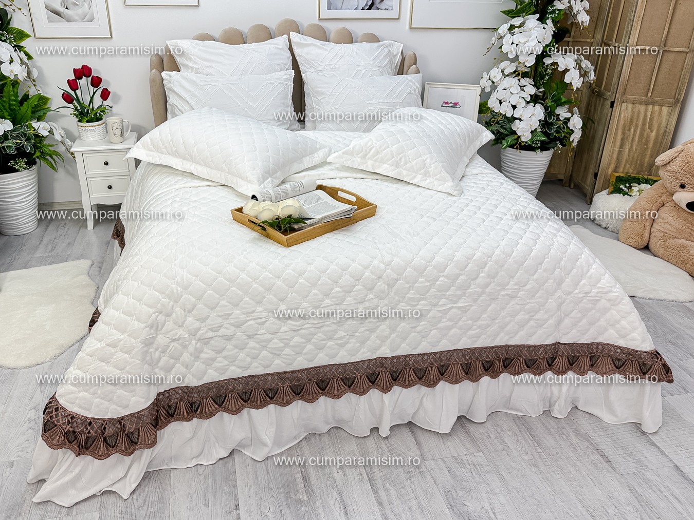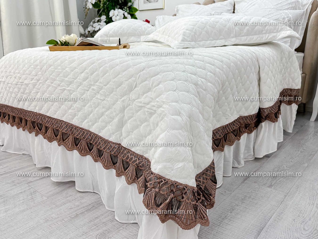 Cuvertura de lux, pentru pat 2 persoane, din catifea, matlasata, cu volanase pe partea de jos, accesorizate cu o eleganta broderie aurier, pentru un plus de eleganta si rafinament. Cuverturile de pat sunt cele mai potrivite pentru anotimpul rece.  Totodata, ele adauga mai multa caldura dormitorului tau. Setul vine ambalat in husa transparenta din plastic - poate fi folosita ca husa pentru depozitare sau ca ambalaj pentru a darui celor dragi aceasta minunata cuvertura. Avantajele cuvert