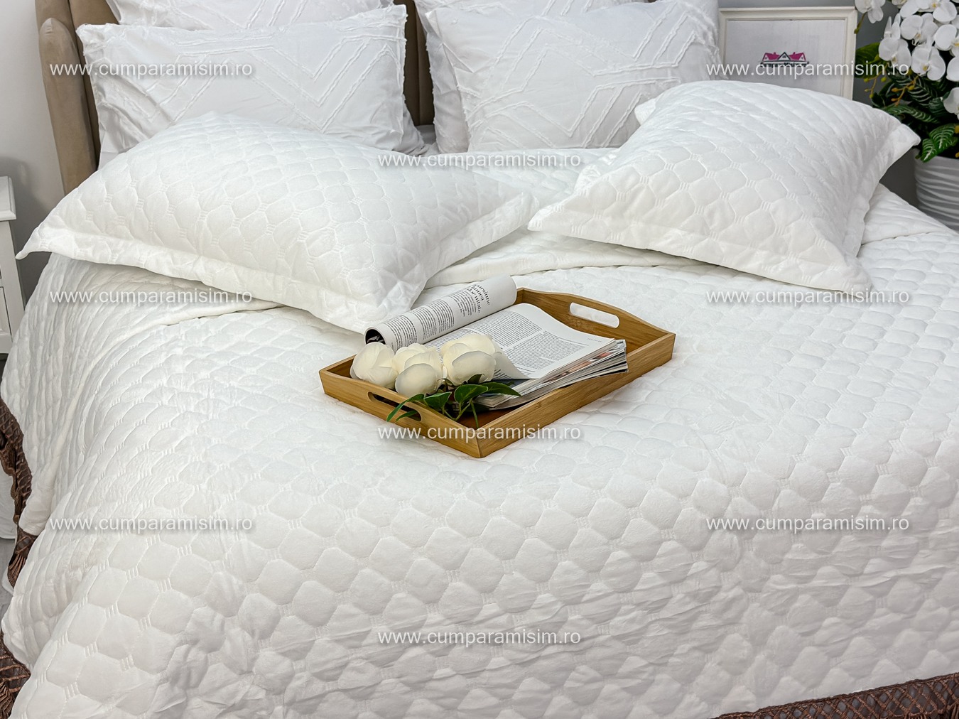 Cuvertura pat dublu, 3 piese, Catifea Matlasata cu Broderie Aurie, 250x270cm, Jojo Home, Alb