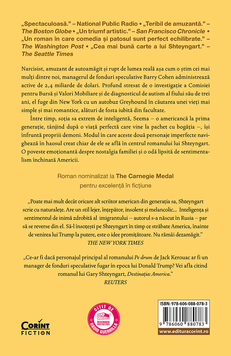 Narcisist, amuzant de autoamăgit și rupt de lumea reală așa cum o știm cei mai mulți dintre noi, managerul de fonduri speculative Barry Cohen administrează active de 2,4 miliarde de dolari. Profund stresat de o investigație a Comisiei pentru Bursă și Valori Mobiliare și de diagnosticul de autism al fiului său de trei ani, el fuge din New York cu un autobuz Greyhound în căutarea unei vieți mai simple și mai romantice, alături de fosta iubită din facultate. Între timp, soția sa extrem de inteligentă, Seema – o americancă la prima generație, tânjind după o viață perfectă care vine la pachet cu bogăția – își înfruntă propriii demoni. Modul în care aceste două personaje imperfecte navighează în haosul creat chiar de ele se află în centrul romanului lui Shteyngart. O poveste emoționantă despre nostalgia familiei și o odă lipsită de sentimentalism închinată Americii. „Poate mai mult decât oricare alt scriitor american din generația sa, Shteyngart scrie cu naturalețe. Are un stil lejer, înțepător, insolent și melancolic. . . Inteligența și sentimentul de inimă zdrobită al imigrantului – autorul s-a născut în Rusia – par să se reverse din el. Să-l însoțești pe Shteyngart în timp ce străbate America, înainte de venirea lui Trump la putere, este o idee promițătoare. Nu rămâi dezamăgit.” – The New York Times „Ce-ar fi dacă personajul principal al romanului Pe drum de Jack Kerouac ar fi un manager de fonduri speculative, fugar în epoca lui Donald Trump? Vei afla citind romanul lui Gary Shteyngart, Destinația: America.” – Reuters „Acesta este un roman care pare să fi fost creat în timp real, reflectând cu un comic perfect și un tragic îngrozitor exact ceea ce simte America în această clipă. În timp ce citeam Destinația: America, am izbucnit în râs în vreme ce mă crispam de durere. Gary Shteyngart a pus în fața culturii americane o oglindă care este atât de precisă și, totodată, devastatoare, încât îți vine să ți-o spargi în cap. Și asta este un lucru bun. Romanul este extraordinar.” – Elizabeth Gilbert „O călătorie de un umor negru în chiar inima Americii din epoca Trump, una care sondează recompensele narcisismului, critică excesele ultrabogaților și, în cele din urmă, pune sub semnul întrebării speranța că vom putea găsi căi de a depăși diferențele clar existente și de a fi mai buni unii cu alții.” – The Atlantic NUMITĂ UNA DINTRE CELE MAI BUNE CĂRȚI ALE ANULUI DE: THE NEW YORK TIMES BOOK REVIEW • NPR • THE WASHINGTON POST • O, THE OPRAH MAGAZINE • MOTHER JONES • GLAMOUR • LIBRARY JOURNAL • KIRKUS REVIEWS • NEWSDAY • PAMELA PAUL, KQED • FINANCIAL TIMES • THE GLOBE AND MAIL