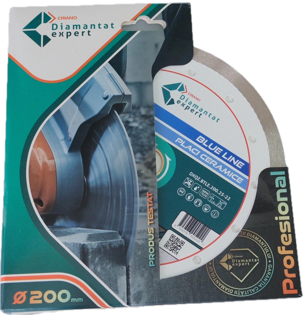 Disc DiamantatExpert pt. Ceramica, Gresie Portelanata de Duritate Medie, Placi 200x25,4/22.23(ring) (mm) taiere uscata sau umeda, Blue Line Profesional - DXQZ.BTLE.200.25-22 Calitate : Blue Line Profesional - calitate profesională de bună performanță DIY Pentru : gresie duritate medie, plăci porțelanate, granit subțire, plăci de marmură, faianță Tăiere : cu apă Utilizare cu : polizor unghiular (~8,500rpm max) Descriere Discul cu coroană continuă este proiectat pentru tăieturi precise în gresie, faianță și plăci porțelanate , oferind margini fine fără ciobire. Funcționează excelent atât în regim uscat , cât și cu apă . Ideal pentru polizoare unghiulare sau fierăstraie cu apă. Tăietură fină fără ciobire - Coroana continuă asigură margini curate și fără deteriorări. Segment presat la cald / sinterizat – Durabilitate mare pentru utilizări semi-profesionale. Coroană Continuă - Viteză crescută de tăiere combinată cu un finisaj fin – ideal pentru versatilitate. Durată mare de viață – Segment de 10 mm pentru performanță extinsă la tăiere și economie pe termen lung. Blue Line Profesional – Randament bun la preț accesibil – soluția ideală pentru faianțari, finisori interiori și meșteri avansați. Durata de viață: Bună 3/6 Viteza de tăiere: Bună 3/6 Diametru disc ext. x int.: 200 x 25,4/22.23(ring) mm Inaltime segment: 10,0mm. Grosime segment: 1,8mm.