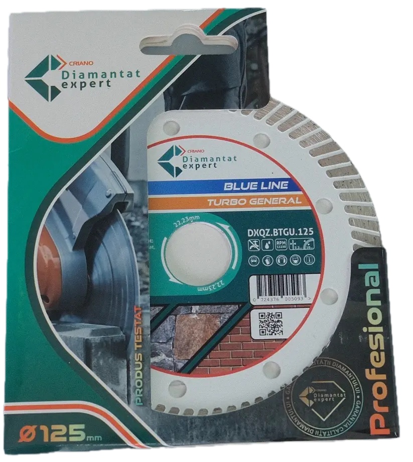 Disc DiamantatExpert TURBO pt. Beton Ranforsat Usor, Materiale de constructii 125x22.23 (mm) taiere uscata sau umeda, Blue Line Profesional - DXQZ.BTGU.125 Calitate : Blue Line Profesional - calitate profesională de bună performanță DIY Pentru : beton armat ușor, beton, plăci subțiri din piatră naturală, cărămizi Tăiere : uscată sau cu apă Utilizare cu : polizor unghiular (12,250rpm max) Descriere Proiectat pentru tăieri generale , acest disc combină acțiunea agresivă de tăiere turbo cu finisajul neted al lamei continue. Găurile din apropierea marginii discului permit răcirea eficientă în aplicații fără răcire cu apă (DRY) . Utilizare generală versatilă – Beton, cărămizi dure, piatră naturală – un singur disc pentru mai multe aplicații. Segment presat la cald / sinterizat – Durabilitate mare pentru utilizări semi-profesionale. Segment Hibrid Turbo-Continu - Viteză crescută de tăiere combinată cu un finisaj fin – ideal pentru versatilitate. Durată mare de viață – Segment de 10 mm pentru performanță extinsă la tăiere și economie pe termen lung. Blue Line Profesional – Randament bun la preț accesibil – alegerea perfectă pentru șantiere mici sau bricolaj avansat. Durata de viață: Bună 3/6 Viteza de tăiere: Bună 3/6 Diametru disc ext. x int.: 125 x 22,23mm Inaltime segment: 10,0mm. Grosime segment: 2,2mm.