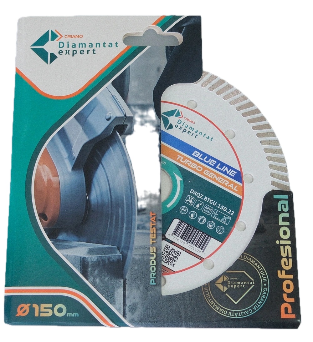 Disc DiamantatExpert TURBO pt. Beton Ranforsat Usor, Materiale de constructii 150x22.23 (mm) taiere uscata sau umeda, Blue Line Profesional - DXQZ.BTGU.150 Calitate : Blue Line Profesional - calitate profesională de bună performanță DIY Pentru : beton armat ușor, beton, plăci subțiri din piatră naturală, cărămizi Tăiere : uscată sau cu apă Utilizare cu : polizor unghiular (12,250rpm max) Descriere Proiectat pentru tăieri generale , acest disc combină acțiunea agresivă de tăiere turbo cu finisajul neted al lamei continue. Găurile din apropierea marginii discului permit răcirea eficientă în aplicații fără răcire cu apă (DRY) . Utilizare generală versatilă – Beton, cărămizi dure, piatră naturală – un singur disc pentru mai multe aplicații. Segment presat la cald / sinterizat – Durabilitate mare pentru utilizări semi-profesionale. Segment Hibrid Turbo-Continu - Viteză crescută de tăiere combinată cu un finisaj fin – ideal pentru versatilitate. Durată mare de viață – Segment de 10 mm pentru performanță extinsă la tăiere și economie pe termen lung. Blue Line Profesional – Randament bun la preț accesibil – alegerea perfectă pentru șantiere mici sau bricolaj avansat. Durata de viață: Bună 3/6 Viteza de tăiere: Bună 3/6 Diametru disc ext. x int.: 150 x 22,23mm Inaltime segment: 10,0mm. Grosime segment: 2,4mm.