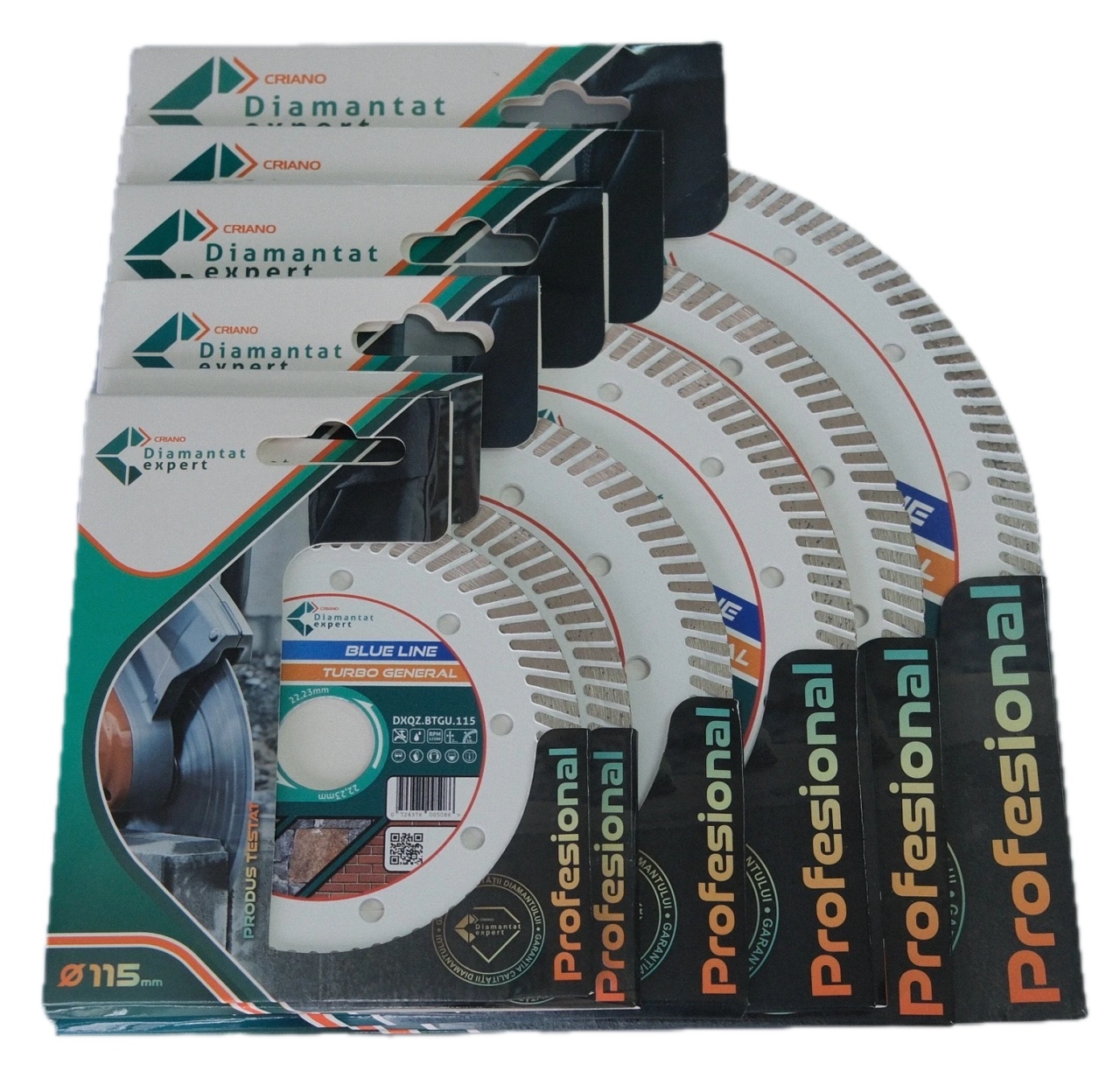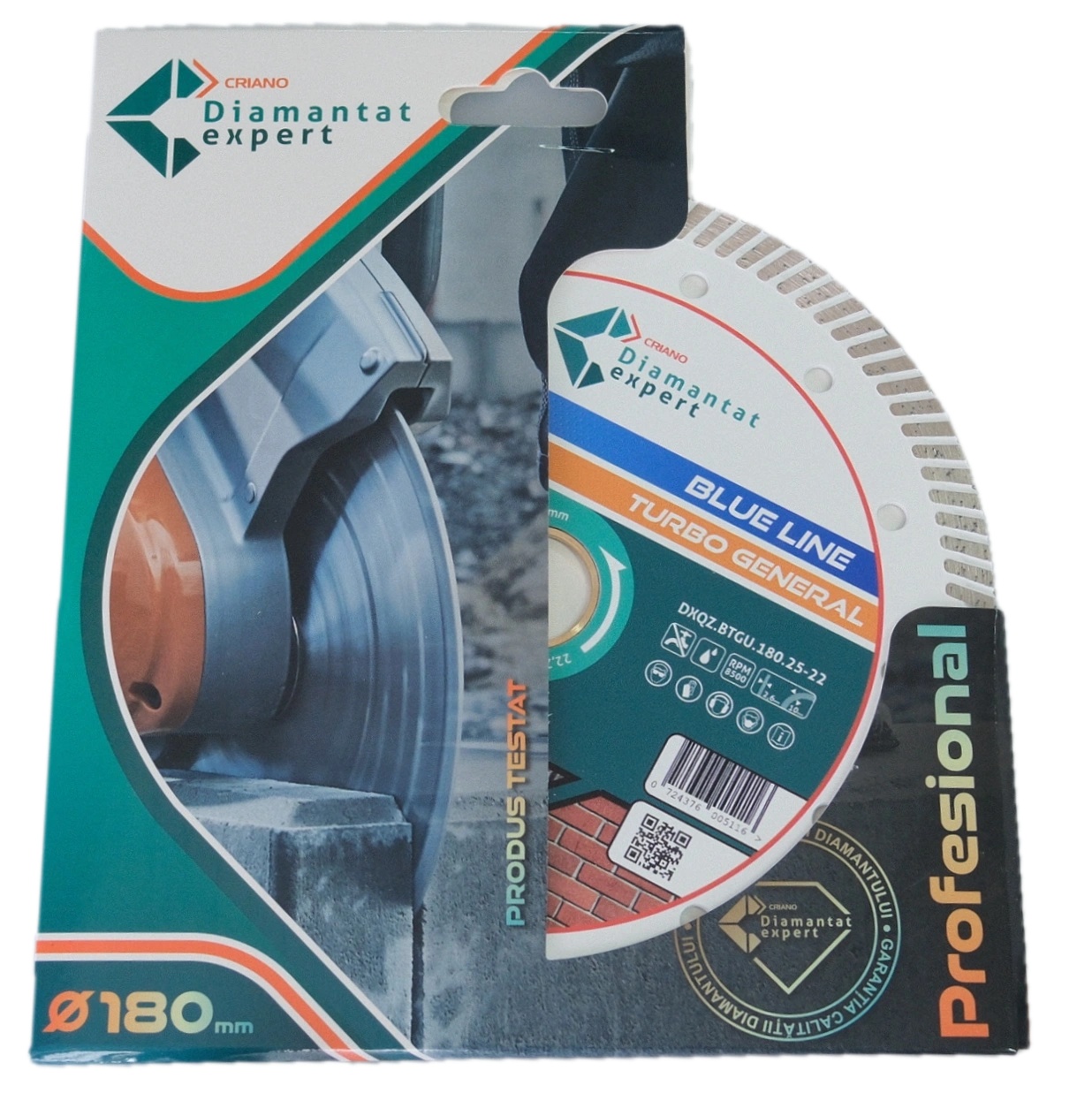 Disc DiamantatExpert TURBO pt. Beton Ranforsat Usor, Materiale de constructii 180x25,4/22.23(ring) (mm) taiere uscata sau umeda, Blue Line Profesional - DXQZ.BTGU.180.25-22 Calitate : Blue Line Profesional - calitate profesională de bună performanță DIY Pentru : beton armat ușor, beton, plăci subțiri din piatră naturală, cărămizi Tăiere : uscată sau cu apă Utilizare cu : polizor unghiular (8,500rpm max) Descriere Proiectat pentru tăieri generale , acest disc combină acțiunea agresivă de tăiere turbo cu finisajul neted al lamei continue. Găurile din apropierea marginii discului permit răcirea eficientă în aplicații fără răcire cu apă (DRY) . Utilizare generală versatilă – Beton, cărămizi dure, piatră naturală – un singur disc pentru mai multe aplicații. Segment presat la cald / sinterizat – Durabilitate mare pentru utilizări semi-profesionale. Segment Hibrid Turbo-Continu - Viteză crescută de tăiere combinată cu un finisaj fin – ideal pentru versatilitate. Durată mare de viață – Segment de 10 mm pentru performanță extinsă la tăiere și economie pe termen lung. Blue Line Profesional – Randament bun la preț accesibil – alegerea perfectă pentru șantiere mici sau bricolaj avansat. Durata de viață: Bună 3/6 Viteza de tăiere: Bună 3/6 Diametru disc ext. x int.: 180 x 25,4 / 22,23 mm Inaltime segment: 10,0mm. Grosime segment: 2,6mm.