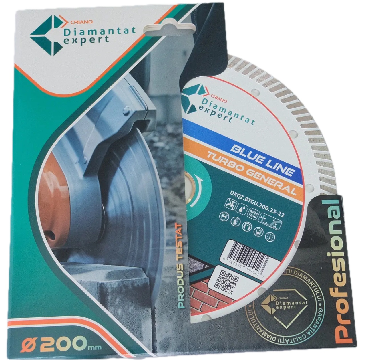 Disc DiamantatExpert TURBO pt. Beton Ranforsat Usor, Materiale de constructii 200x25,4/22.23(ring) (mm) taiere uscata sau umeda, Blue Line Profesional - DXQZ.BTGU.200.25-22 Calitate : Blue Line Profesional - calitate profesională de bună performanță DIY Pentru : beton armat ușor, beton, plăci subțiri din piatră naturală, cărămizi Tăiere : uscată sau cu apă Utilizare cu : polizor unghiular (6,650rpm max) Descriere Proiectat pentru tăieri generale , acest disc combină acțiunea agresivă de tăiere turbo cu finisajul neted al lamei continue. Găurile din apropierea marginii discului permit răcirea eficientă în aplicații fără răcire cu apă (DRY) . Utilizare generală versatilă – Beton, cărămizi dure, piatră naturală – un singur disc pentru mai multe aplicații. Segment presat la cald / sinterizat – Durabilitate mare pentru utilizări semi-profesionale. Segment Hibrid Turbo-Continu - Viteză crescută de tăiere combinată cu un finisaj fin – ideal pentru versatilitate. Durată mare de viață – Segment de 10 mm pentru performanță extinsă la tăiere și economie pe termen lung. Blue Line Profesional – Randament bun la preț accesibil – alegerea perfectă pentru șantiere mici sau bricolaj avansat. Durata de viață: Bună 3/6 Viteza de tăiere: Bună 3/6 Diametru disc ext. x int.: 200 x 25,4 / 22,23 mm Inaltime segment: 10,0mm. Grosime segment: 2,8mm.