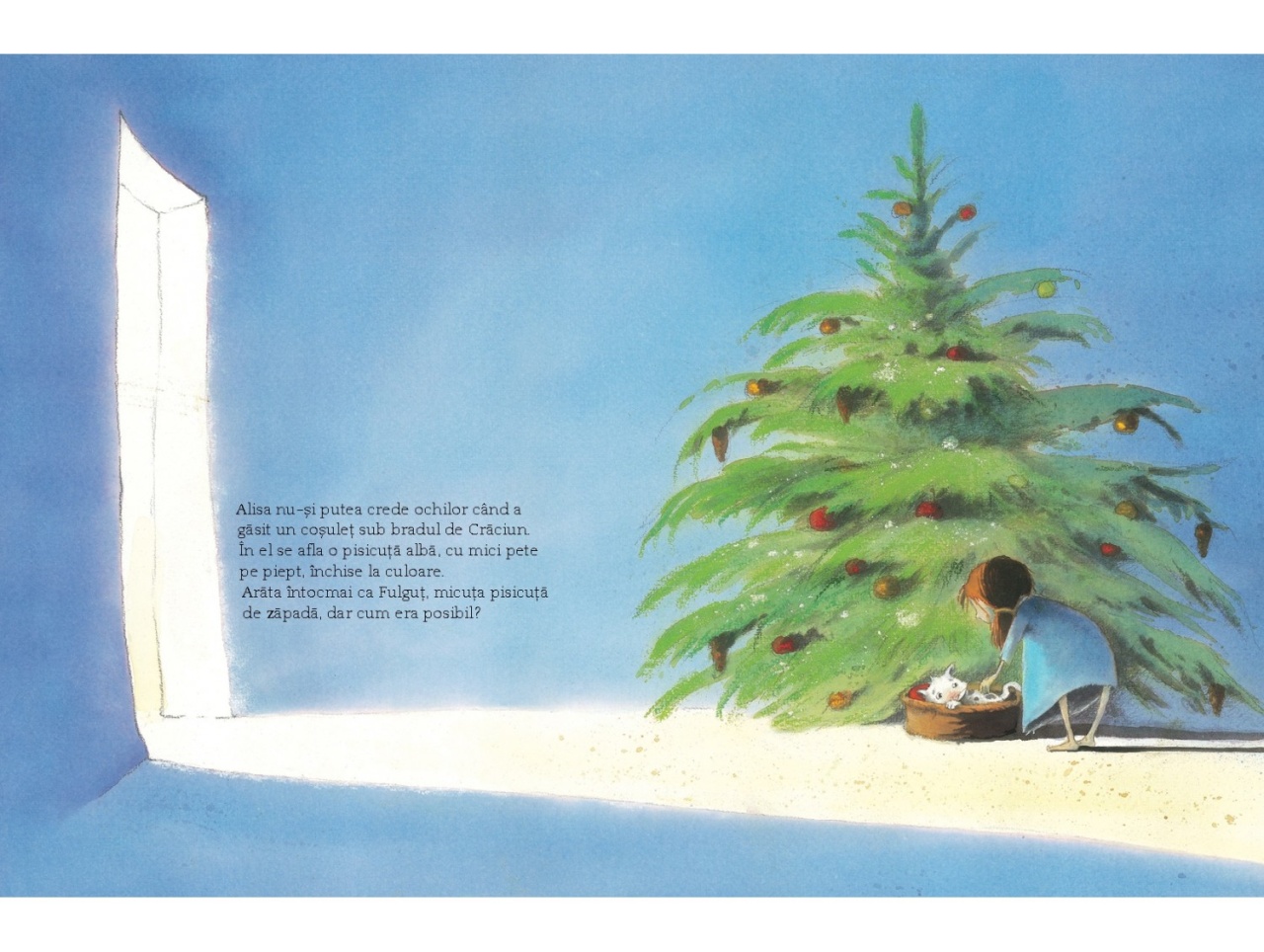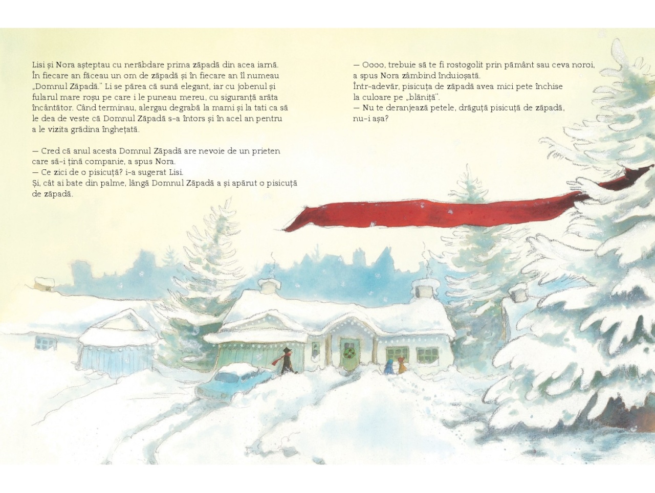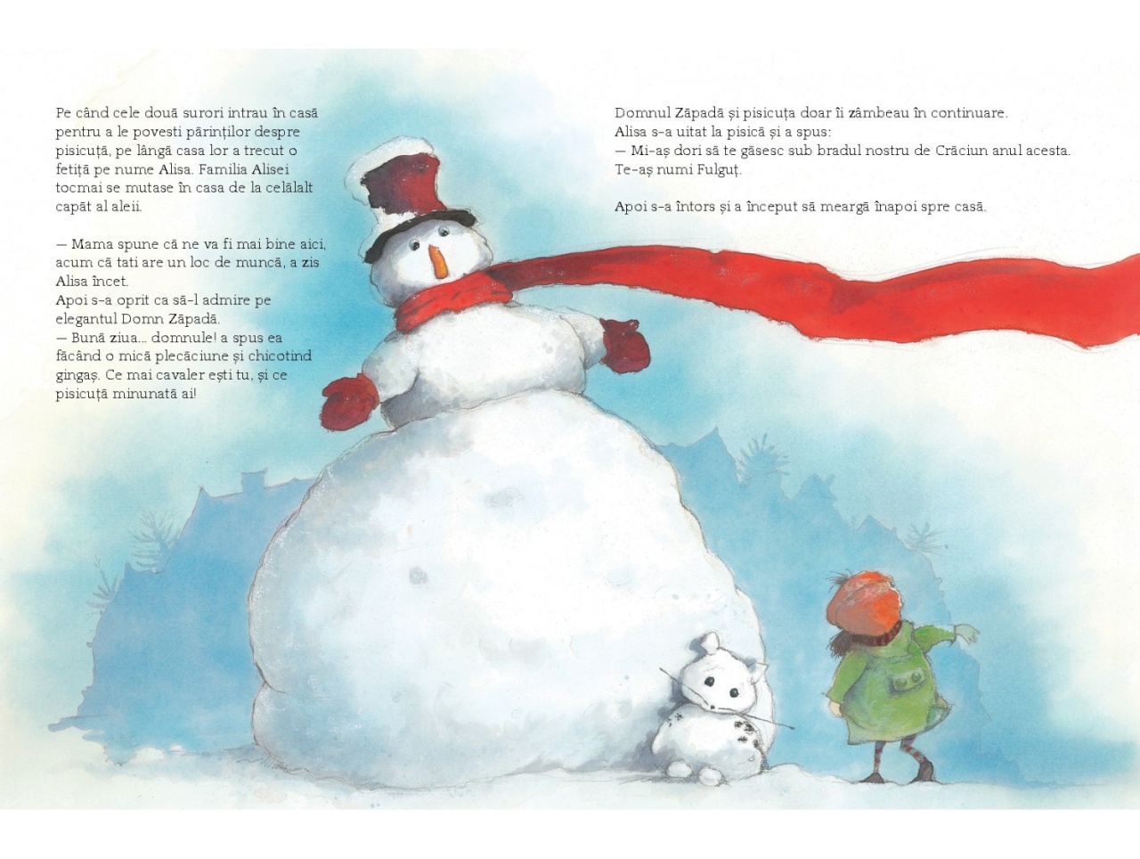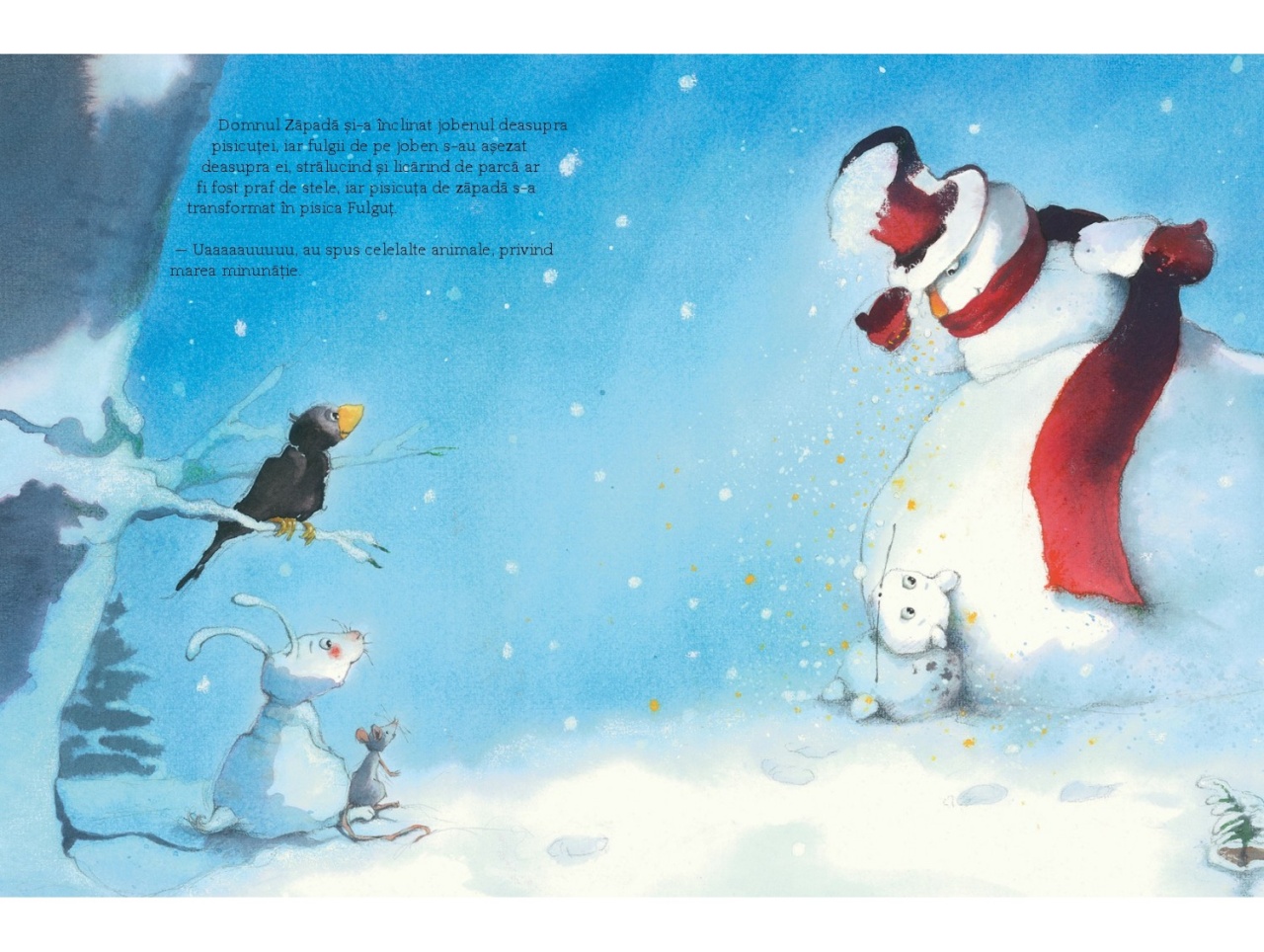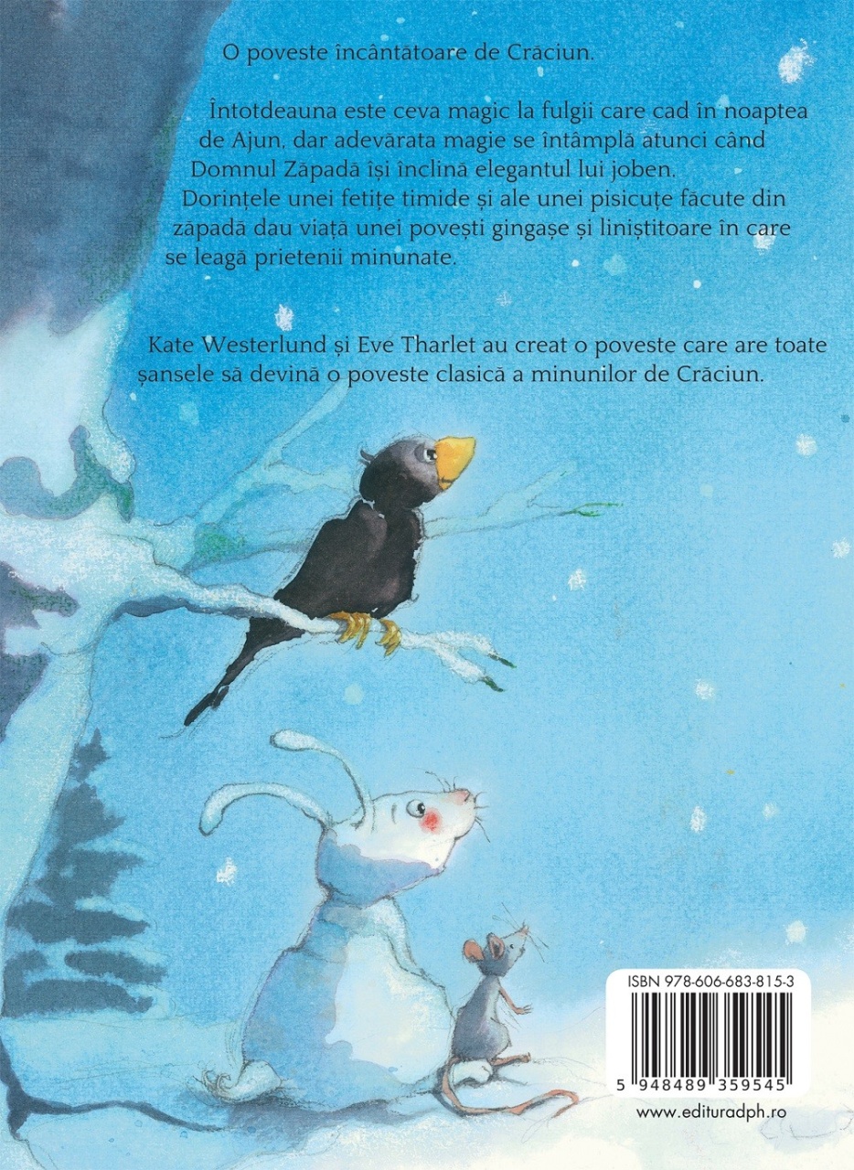 O poveste încântătoare de Crăciun. Întotdeauna este ceva magic la fulgii care cad în noaptea de Ajun, dar adevărata magie se întâmplă atunci când Domnul Zăpadă își înclină elegantul lui joben. Dorințele unei fetițe timide și ale unei pisicuțe făcute din zăpadă dau viață unei povești gingașe și liniștitoare în care se leagă prietenii minunate. Kate Westerlund și Eve Tharlet au creat o poveste care are toate șansele să devină o poveste clasică a minunilor de Crăciun. Specificații Pagini: 32 Mărimi: 21.5 x 28.7 cm Copertă: Cartonată