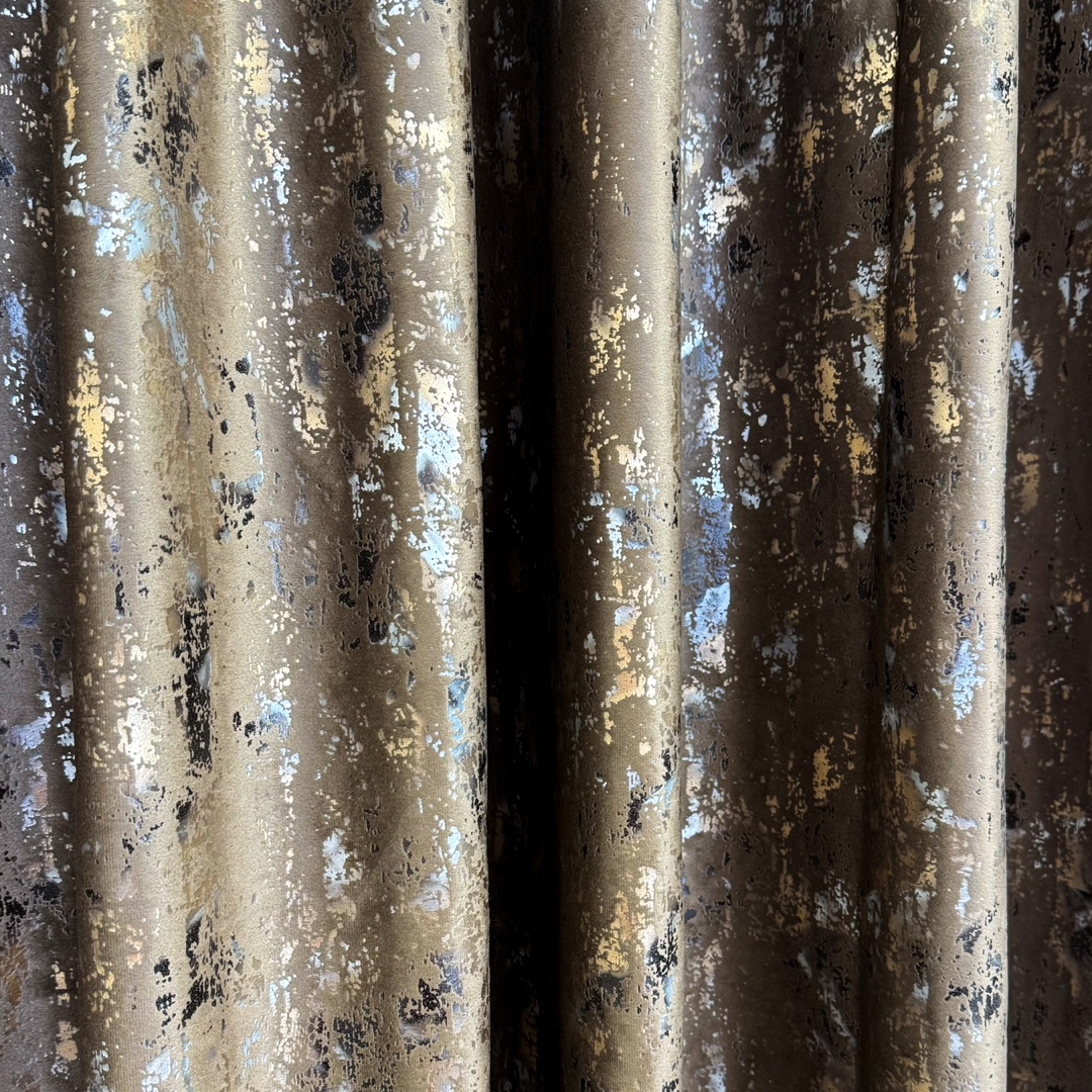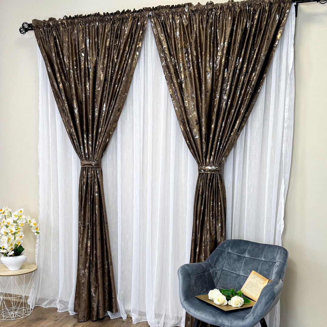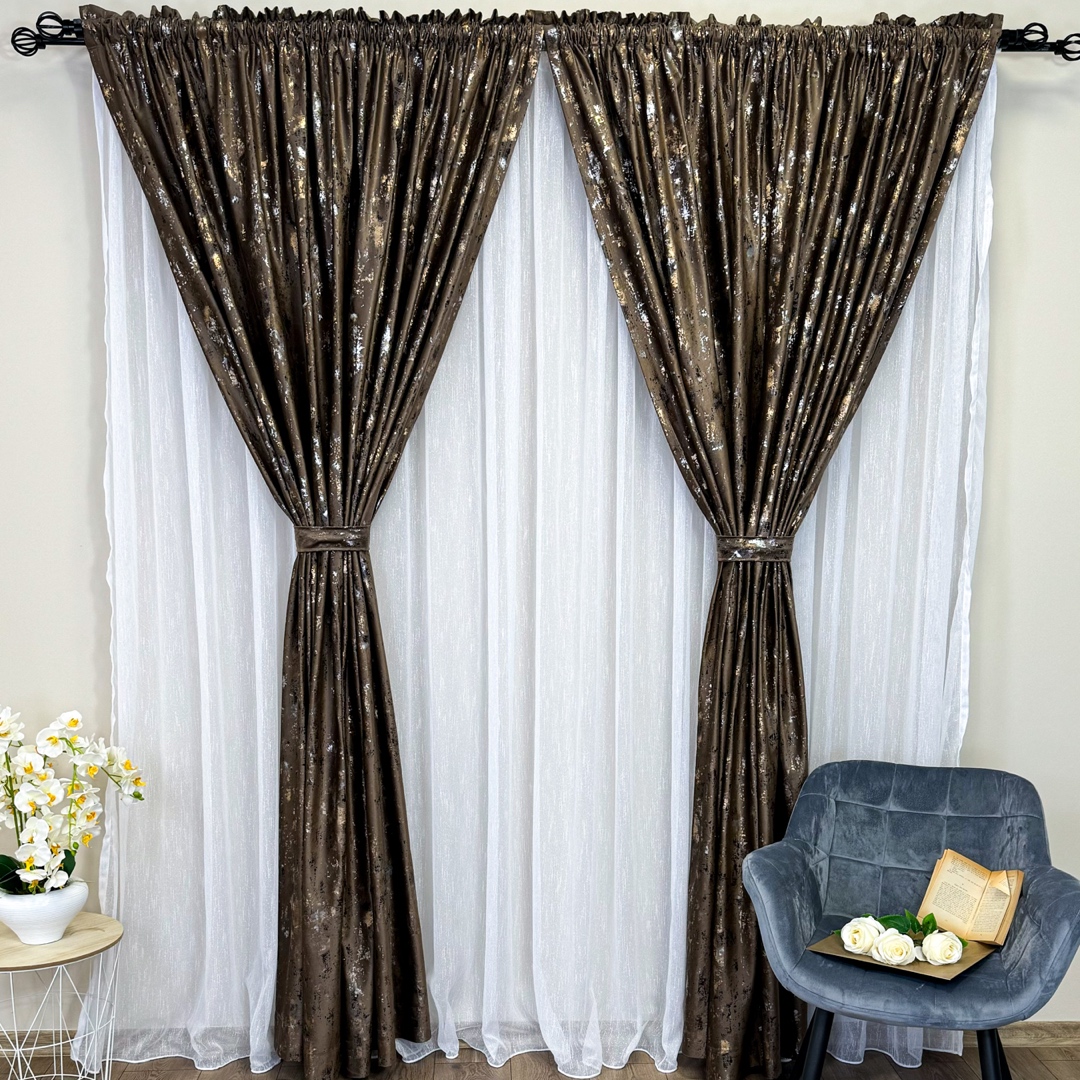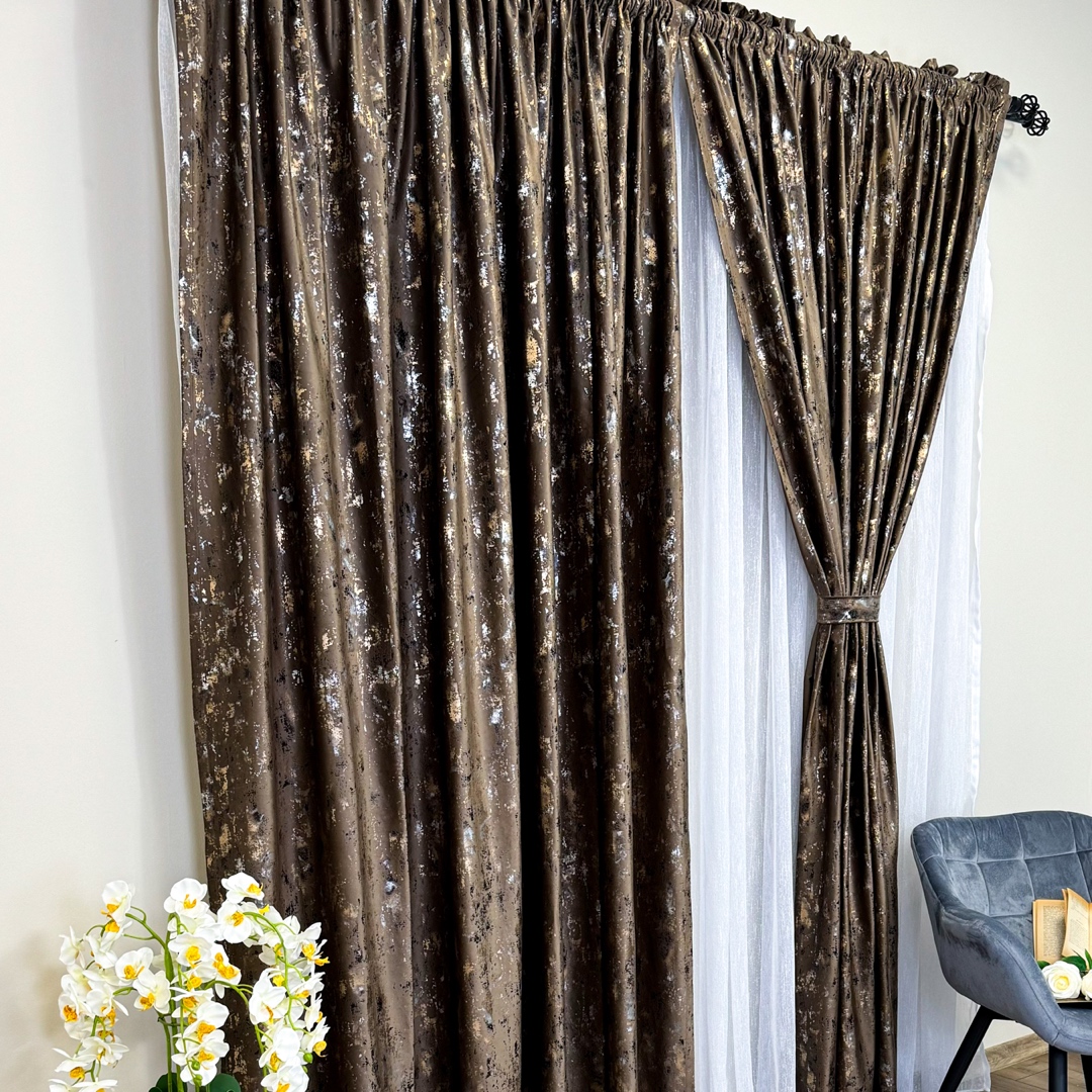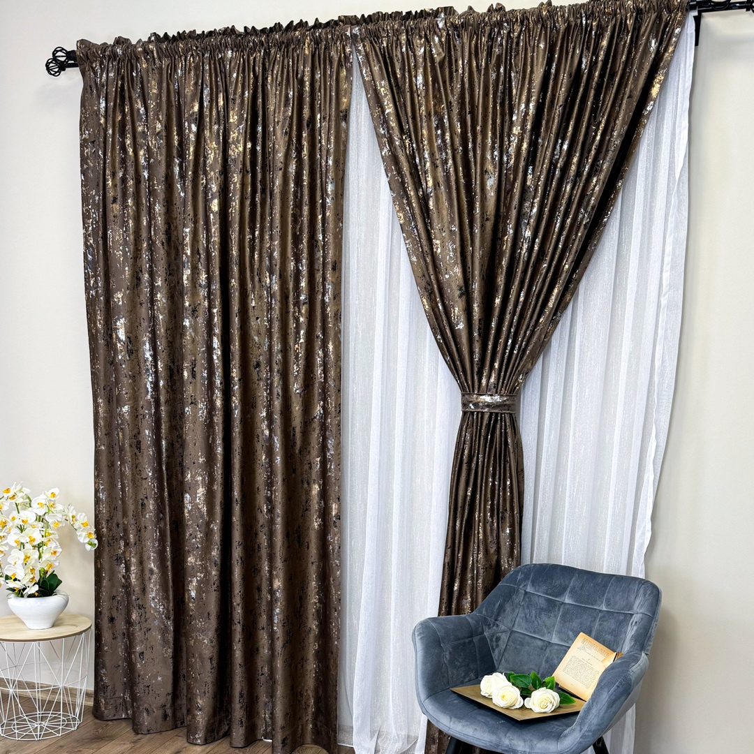 Draperie Catifea CRETA cu insertii aurii, Maro - V44, 140cm latime x 260cm inaltime, cu tiv lat pt bara