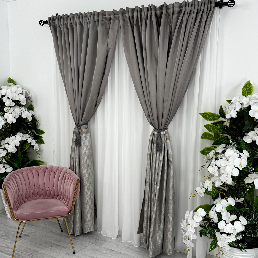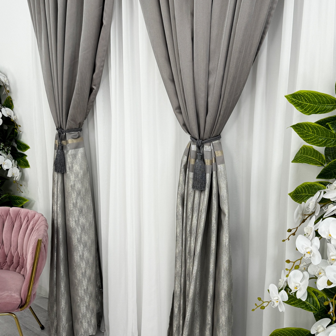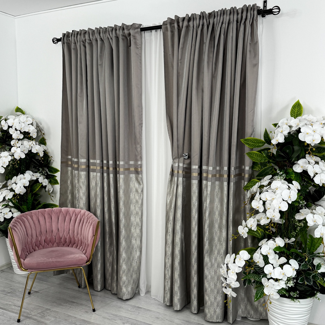 Draperiile Elite reprezinta o alegere sofisticata si luxoasa pentru orice incapere. Aceste draperii sunt confectionate dintr-un material de inalta calitate, care ofera o textura moale si bogata, aducand un sentiment de rafinament si eleganta in orice spatiu.  Ceea ce face draperiile cu adevarat remarcabile sunt detaliile aurii. Aceste insertii metalizate adauga un element de stralucire si glamour, creand un contrast elegant cu textura mata a materialului. Fie ca sunt plasate intr-un li
