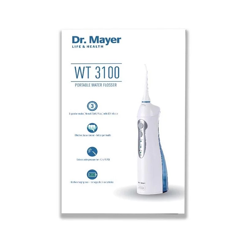 Revolutioneaza-ti stilul de igiena orala, cu produsele Dr. Mayer. One Touch si Multi Pulse – tehnologii esentiale pentru indepartarea eficienta a placii bacteriene si a tartrului. Descriere: Dusul bucal portabil WT3100 Dr. Mayer curata in locurile greu-accesibile dintre dinti si in profunzimea buzunarelor gingivale, indepartand resturile si tartrul ce contribuie la aparitia cariilor, imbolnavirea gingiilor si a respiratiei urat mirositoare. Tehnologie Multi Pulse Tehnologia Multi Pulse cu 3 moduri de operare (normal, sensibil și pulsat) si indicator LED, ofera o presiune a apei de la 40 la 90 PSI cu 1400 de pulsatii pe minut. Anti placa bacteriana Indeparteaza bacteriile in profunzime, dintre dinti si de sub linia gingiilor acolo unde periajul și ata dentara nu ajung Maseaza si stimuleaza gingiile Maseaza si stimuleaza gingiile pentru a imbunatati circulatia si a va pastra gingiile puternice si sanatoase Recomandat de medicul stomatolog Ideal pentru curatarea din jurul puntilor dentare, aparatelor dentare si coroanelor dentare. Design ergonomic, rezistent la apa Manerul conceput ergonomic si furtunul rotativ 360° va permite sa controlati cu usurinta fluxul de apa pentru a ajunge în toate zonele gurii. Caracteristici tehnice: Numar pulsatii/min: 1400 Tehnologia: Multi Pulse Numar trepte de presiune: 3 Mod de curatare: normal, sensibil și pulsat Capacitate rezervor apa: 150 ml Temporizator: Oprire automata dupa finalizarea ciclului de 2 minute Tip alimentare: Acumulator Tip acumulator: Li-Ion Culoare: Alb/Albastru Garantie: 24 de luni Prezentare: Dus bucal portabil WT3100 - 1 bucata Capete de curatare normale – 2 bucati, ce au cod de culoare pentru diferentiere usoara. Incarcator – 1 bucata Utilizare: A se utiliza in functie de recomandarea medicului stomatolog.