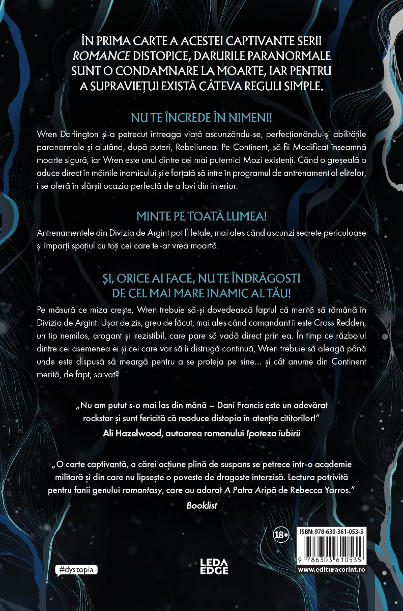 #html-body [data-pb-style=CYVHR4F]{justify-content:flex-start;display:flex;flex-direction:column;background-position:left top;background-size:cover;background-repeat:no-repeat;background-attachment:scroll}NU TE ÎNCREDE ÎN NIMENI! Wren Darlington și-a petrecut întreaga viață ascunzându-se, perfecționându-și abilitățile paranormale și ajutând, după puteri, Rebeliunea. Pe Continent, să fii Modificat înseamnă moarte sigură, iar Wren este unul dintre cei mai puternici Mozi existenți. Când o greșeală o aduce direct în mâinile inamicului și e forțată să intre în programul de antrenament al elitelor, i se oferă în sfârșit ocazia perfectă de a lovi din interior. MINTE PE TOATĂ LUMEA! Antrenamentele din Divizia de Argint pot fi letale, mai ales când ascunzi secrete periculoase și împarți spațiul cu toți cei care te-ar vrea moartă. ȘI, ORICE AI FACE, NU TE ÎNDRĂGOSTI DE CEL MAI MARE INAMIC AL TĂU! Pe măsură ce miza crește în acest thriller new adult, Wren trebuie să-și dovedească faptul că merită să rămână în Divizia de Argint. Ușor de zis, greu de făcut, mai ales când comandant îi este Cross Redden, un tip nemilos, arogant și irezistibil, care pare să vadă direct prin ea. În timp ce războiul dintre cei asemenea ei și cei care vor să îi distrugă continuă, Wren trebuie să aleagă până unde este dispusă să meargă pentru a se proteja pe sine… și cât anume din Continent merită, de fapt, salvat? „Nu am putut s-o mai las din mână – Dani Francis este un adevărat rockstar și sunt fericită că readuce distopia în atenția cititorilor!” Ali Hazelwood, autoarea romanului Ipoteza iubirii „O carte captivantă, a cărei acțiune plină de suspans se petrece într-o academie militară și din care nu lipsește o poveste de dragoste interzisă. Lectura potrivită pentru fanii genului romantasy, care au adorat A Patra Aripă de Rebecca Yarros.” Booklist „Nici nu mi-am dat seama cât de mult mi-a lipsit fantasy-ul distopic până n-am devorat această carte! Elita de Argint este un roman alert, plin de adrenalină, cu personaje memorabile și o intrigă ce te prinde de la prima pagină până la ultima.” Olivia Wildenstein, autoarea romanului House of Beating Wings „Incredibil de captivantă – nu puteam să dau paginile suficient de repede!” L. K. Steven, autoarea romanului Silvercloak „Pentru cititorii care au crescut cu romane precum Jocurile Foamei sau Divergent, am o veste bună: a apărut o distopie must-read.” PureWow „Asemenea lui Katniss Everdeen sau Violet Sorrengail, Wren are o busolă morală puternică, pusă la grea încercare fizic și emoțional atunci când se confruntă cu obstacole aparent imposibil de depășit.” The Washington Post „Elita de Argint are toate ingredientele unei serii blockbuster și sunt 100% pregătită pentru această aventură. N-am nicio îndoială că va deveni rapid cartea preferată a cititorilor.” The Everygirl