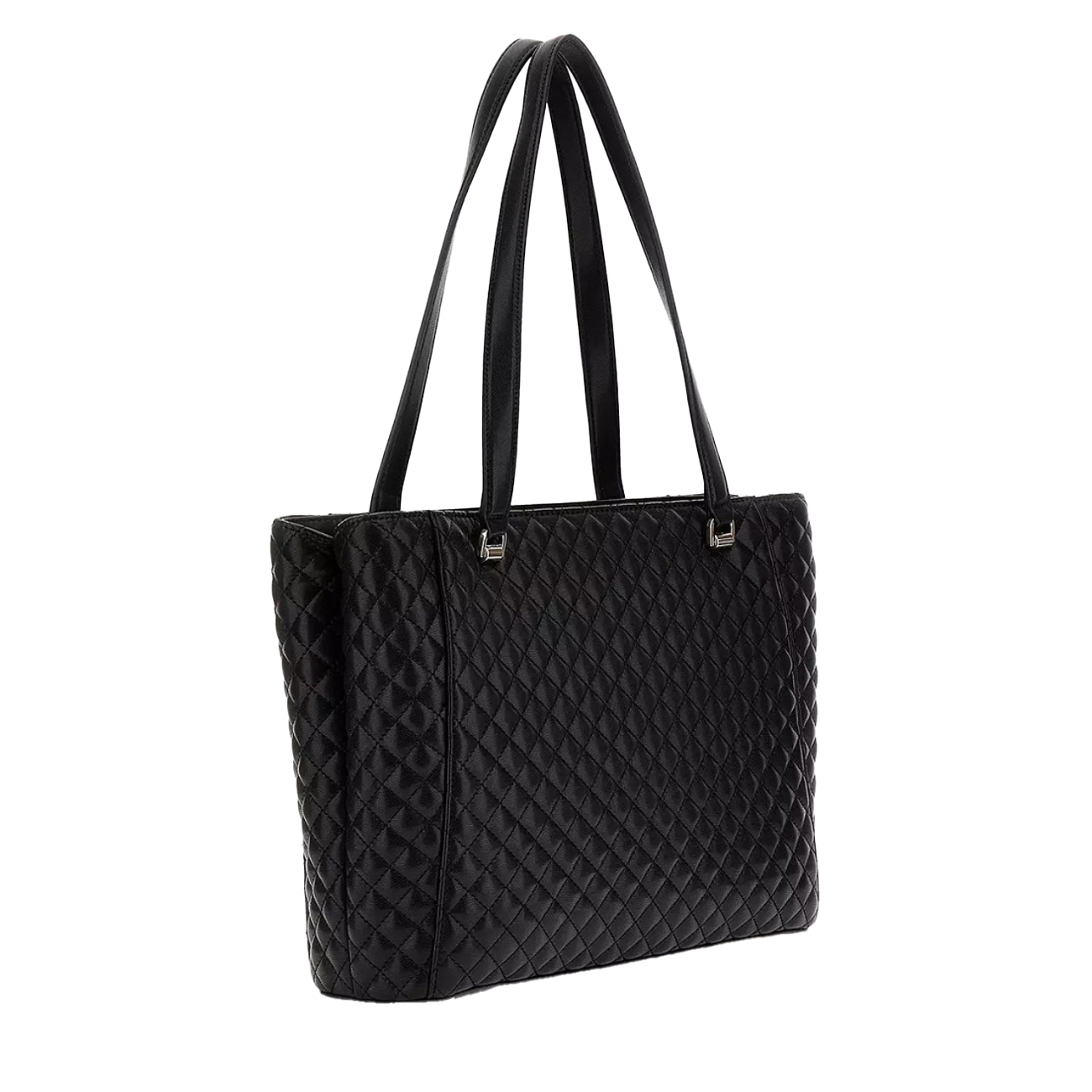 Geanta de umăr Everlee Noel Tote de la Guess îmbină eleganța rafinată cu un aer jucăuș și feminin, fiind un accesoriu versatil pentru stilul de zi cu zi. Construită din material sintetic cu finisaj matlasat, aceasta atrage privirile prin textura sa sofisticată în model romboidal. Elementul central de atracție este lanțul decorativ metalic cu charm-uri strălucitoare, floare, inimă, lacăt, inițiala „G” și alte simboluri ce adaugă un plus de personalitate și farmec. Logo-ul triunghi iconic Guess este poziționat central pe partea frontală, completând armonios designul. Compartimentarea interioară este practică și generoasă, ideală pentru organizarea eficientă a obiectelor personale. Mânerele duble permit purtarea confortabilă pe umăr, făcând această geantă o alegere perfectă pentru o ținută casual elegantă sau pentru o zi activă în oraș.