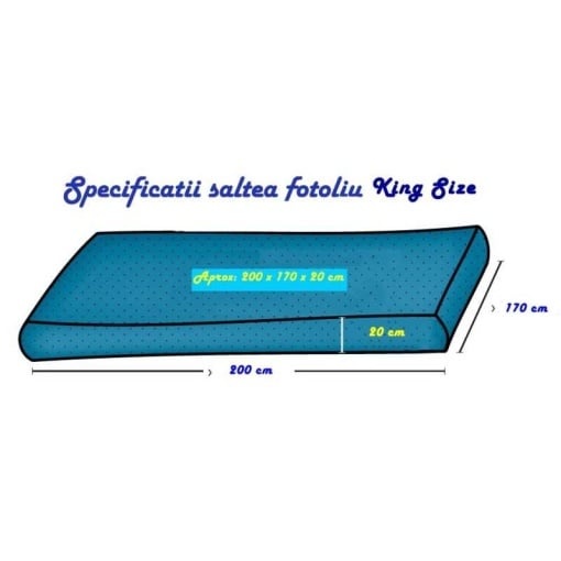 KING SIZE - Fotoliul pentru relaxare suprema Dupa cum iti poti da seama si din denumire, modelul King Size este regele modelelor Pufrelax! Dar nu doar ca este regele fotoliilor puf, ci te rasfata pe tine ca si cum ai fi un rege (sau regina)! Imagineaza-ti un nor pufos care te ia in brate, fie ca esti obosit si vrei doar sa te relaxezi, sa adormi usor (nu uita sa te acoperi, cu siguranta somnul va fi lung), fie ca vrei sa citesti, sa lucrezi, sa te uiti la un film, sau sa te bucuri de rasfat cu cei dragi. Fotoliile cu burete Memory Mix sunt atat de comode, incat le consideram o comoara a relaxarii. Cu o forma ergonomica si un amestec unic de burete cu spuma, acest fotoliu se adapteaza perfect conturului corpului, oferind suport si confort absolut. Este locul unde poti sa te afunzi cu placere dupa o zi lunga, sa te destresezi si sa te regasesti in propriul tau cuib. Foarte multi clienti ce lucreaza de acasa l-au comandat si il folosesc cu succes, pentru ca poti sta asezat multe ore, fara sa simti nevoia sa te ridici pentru a-ti readapta pozitia. Fabricat in Romania, cu materiale premium si cusaturi durabile Experimenteaza calitatea superioara a materialelor noastre premium si bucura-te de durabilitatea cusaturilor in timpul sesiunilor intense de relaxare! Fotoliile Pufrelax au o durata mare de viata si o calitate superioara altor fotolii puf de pe piata. De ce să alegi un fotoliu umplut cu Burete Memory Mix? 6 Ani Garantie pentru umplutura de burete Fotoliile Puf umplute cu granule de polistiren sunt comode, dar cele umplute cu burete Memory Mix sunt next level! Ne mandrim cu faptul ca suntem pionieri in aducerea pe piata din Romania a fotoliilor umplute cu burete Memory Mix, redefinind conceptul de confort si inovatie. Cand existau doar fotolii clasice cu perle de polistiren, noi am adus romanilor acea senzatie magica de a te scufunda intr-un norisor de puf. Cu o garantie de 6 ani, fotoliul KING SIZE isi pastreaza forma initiala, nu se taseaza, nefiind nevoie de reumplere, spre deosebire de fotoliile cu granule. 3 Ani Garantie pentru husa textila Beneficiezi de o garantie de 3 ani pentru husa, oferindu-ti linistea ca produsul tau va ramane in cea mai buna stare cat mai mult timp. Husa detasabila si lavabila Cu o husa detasabila si lavabila, curatarea devine o joaca de copii. Avand si o husa interioara, fotoliul este usor de intretinut, fara a exista riscul ca umplutura se revarsa. Husa exterioara poate fi spalata la masina de spalat la 30 de grade Celsius, mentinandu-ti fotoliul mereu curat si igienizat. Ai nevoie de un pat de doua persoane? Fotoliul KING SIZE devine unul in cateva miscari! Fotoliul cu burete memory mix ofera mai mult decat o simpla experienta de relaxare. Acesta are o saltea interioara care se poate scoate si transforma intr-o saltea de doua persoane. Astfel, devine ideal pentru dormit pe burete memory, fie ca este pentru musafiri neprevazuti, seri de film in compania celor dragi sau pur si simplu pentru a te bucura de relaxare intr-un mod versatil. Transformarea sa rapida si usoara il face o alegere practica si plina de functionalitate in orice mediu. Este nevoie de doua persoane pentru manevrare, iar la final poti strange la loc, fiind inapoi un fotoliu comod. Precum in secventa de mai jos, inainte de a te aseza pe King Size-ul tau, pentru confort maxim, iti recomandam sa-l framanti/reasezi putin, pentru a-l face sa-si recapete volumul: Dimensiuni: Inaltime - aprox. 65 cmLatime - aprox. 100 cm Lungime - aprox. 120 cm Masa - aprox. 12 kg Dimensiuni saltea interioara: 200x170x15 cm Accesorile (atat suportul de picioare - otomat cat si perna, incluse in seturi) au husa detasabila, avand dimensiunile: Dimensiuni Otoman: 47x45x45 cm Perna decorativa: 35x35 cm Disclaimer: Pozele secundare precum si videoclipurile au titlu de prezentare sau rol exemplificativ.