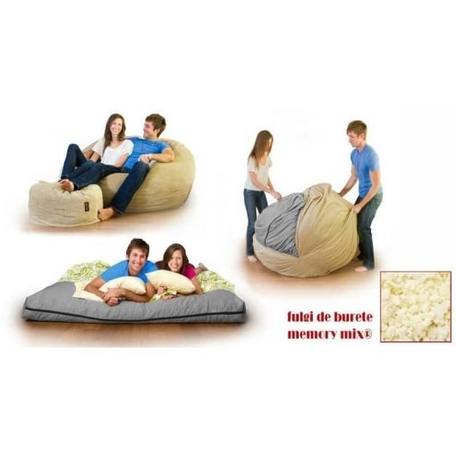 KING SIZE - Fotoliul pentru relaxare suprema Dupa cum iti poti da seama si din denumire, modelul King Size este regele modelelor Pufrelax! Dar nu doar ca este regele fotoliilor puf, ci te rasfata pe tine ca si cum ai fi un rege (sau regina)! Imagineaza-ti un nor pufos care te ia in brate, fie ca esti obosit si vrei doar sa te relaxezi, sa adormi usor (nu uita sa te acoperi, cu siguranta somnul va fi lung), fie ca vrei sa citesti, sa lucrezi, sa te uiti la un film, sau sa te bucuri de rasfat cu cei dragi. Fotoliile cu burete Memory Mix sunt atat de comode, incat le consideram o comoara a relaxarii. Cu o forma ergonomica si un amestec unic de burete cu spuma, acest fotoliu se adapteaza perfect conturului corpului, oferind suport si confort absolut. Este locul unde poti sa te afunzi cu placere dupa o zi lunga, sa te destresezi si sa te regasesti in propriul tau cuib. Foarte multi clienti ce lucreaza de acasa l-au comandat si il folosesc cu succes, pentru ca poti sta asezat multe ore, fara sa simti nevoia sa te ridici pentru a-ti readapta pozitia. Fabricat in Romania, cu materiale premium si cusaturi durabile Experimenteaza calitatea superioara a materialelor noastre premium si bucura-te de durabilitatea cusaturilor in timpul sesiunilor intense de relaxare! Fotoliile Pufrelax au o durata mare de viata si o calitate superioara altor fotolii puf de pe piata. De ce să alegi un fotoliu umplut cu Burete Memory Mix? 6 Ani Garantie pentru umplutura de burete Fotoliile Puf umplute cu granule de polistiren sunt comode, dar cele umplute cu burete Memory Mix sunt next level! Ne mandrim cu faptul ca suntem pionieri in aducerea pe piata din Romania a fotoliilor umplute cu burete Memory Mix, redefinind conceptul de confort si inovatie. Cand existau doar fotolii clasice cu perle de polistiren, noi am adus romanilor acea senzatie magica de a te scufunda intr-un norisor de puf. Cu o garantie de 6 ani, fotoliul KING SIZE isi pastreaza forma initiala, nu se taseaza, nefiind nevoie de reumplere, spre deosebire de fotoliile cu granule. 3 Ani Garantie pentru husa textila Beneficiezi de o garantie de 3 ani pentru husa, oferindu-ti linistea ca produsul tau va ramane in cea mai buna stare cat mai mult timp. Husa detasabila si lavabila Cu o husa detasabila si lavabila, curatarea devine o joaca de copii. Avand si o husa interioara, fotoliul este usor de intretinut, fara a exista riscul ca umplutura se revarsa. Husa exterioara poate fi spalata la masina de spalat la 30 de grade Celsius, mentinandu-ti fotoliul mereu curat si igienizat. Ai nevoie de un pat de doua persoane? Fotoliul KING SIZE devine unul in cateva miscari! Fotoliul cu burete memory mix ofera mai mult decat o simpla experienta de relaxare. Acesta are o saltea interioara care se poate scoate si transforma intr-o saltea de doua persoane. Astfel, devine ideal pentru dormit pe burete memory, fie ca este pentru musafiri neprevazuti, seri de film in compania celor dragi sau pur si simplu pentru a te bucura de relaxare intr-un mod versatil. Transformarea sa rapida si usoara il face o alegere practica si plina de functionalitate in orice mediu. Este nevoie de doua persoane pentru manevrare, iar la final poti strange la loc, fiind inapoi un fotoliu comod. Precum in secventa de mai jos, inainte de a te aseza pe King Size-ul tau, pentru confort maxim, iti recomandam sa-l framanti/reasezi putin, pentru a-l face sa-si recapete volumul: Dimensiuni: Inaltime - aprox. 65 cmLatime - aprox. 100 cmLungime - aprox. 120 cmMasa - aprox. 12 kgDimensiuni saltea interioara: 200x170x15 cm Accesorile (atat suportul de picioare - otomat cat si perna, incluse in seturi) au husa detasabila, avand dimensiunile: Dimensiuni Otoman: 47x45x45 cm Perna decorativa: 35x35 cm Disclaimer: Pozele secundare precum si videoclipurile au titlu de prezentare sau rol exemplificativ.