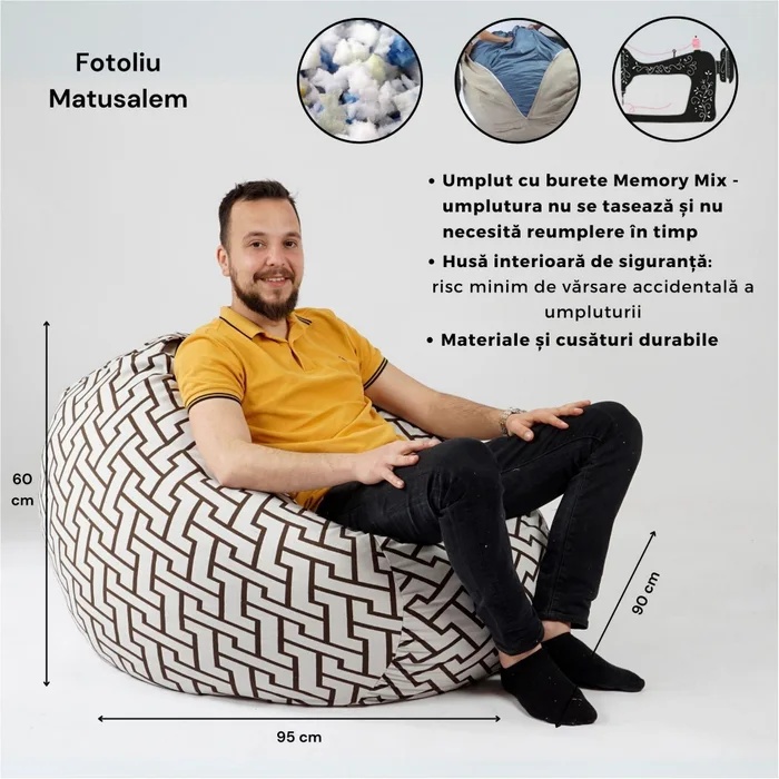 Caracteristici cheie ale fotoliilor Pufrelax Matusalem: Un fotoliu puf Matusalem nu se simte complet fara Suportul pentru picioare (Otoman) si Perna decorativa/de sustinere a capului! Va recomandam setul complet.. clientii care au achizitionat setul complet la recomandarea noastra ne-au sunat si ne-au multumit! :) Si otomanul si perna precum si fotoliul contin un amestec de fulgi de burete memory. Se zice ca o imagine face cat o mie de cuvinte. Iar un film face cat o mie de imagini, nu?! :) Mai jos aveti un film comparativ cu fotoliu Matusalem, King Size si King Size XL: Calitatea nu doar ca nu este neglijata, ci mai mult decat atat, este unul dintre aspectele cele mai importante pe care le avem in vedere. Suntem singurii producatori din Romania care ne ocupam cu crearea acestui tip de fotolii Pufrelax care contine o combinatie de fulgi de burete cu memorie si fulgi de burete normal. Fotoliile umplute cu fulgi de burete nu necesita recompletarea ulterioara, intrucat spre deosebire de cele cu granule, buretele isi pastreaza proprietatile. Ah... si sa nu uitam! Inauntru vei gasi o saltea care poate deveni un pat regesc care ii va uimi pe musafirii tai. Forma - roata Diagonala (cercului) – 100 cm; latimea benzii dintre cercuri – 50 cm. Cubaj: 400 litri Otoman: Diagonala (cercului) – 50 cm; latimea benzii dintre cercuri – 40 cm. Perna: 45 x 45 cm Otoman: Cubaj - 79 litri Otoman: Masa - aproximativ 2 Kg Perna: Masa - aprox 0.5 Kg Dimensiuni SALTEA otoman: 165 cm lungime - 45 cm latime - 10 cm inaltime Precum in secventa de mai jos, inainte de a te aseza pe fotoliul tau puf, Matusalem, pentru confort maxim, iti recomandam sa-l framanti/reasezi putin, pentru a-l face sa-si recapete volumul : Disclaimer: Pozele secundare precum si videoclipurile au titlu de prezentare sau rol exemplificativ.