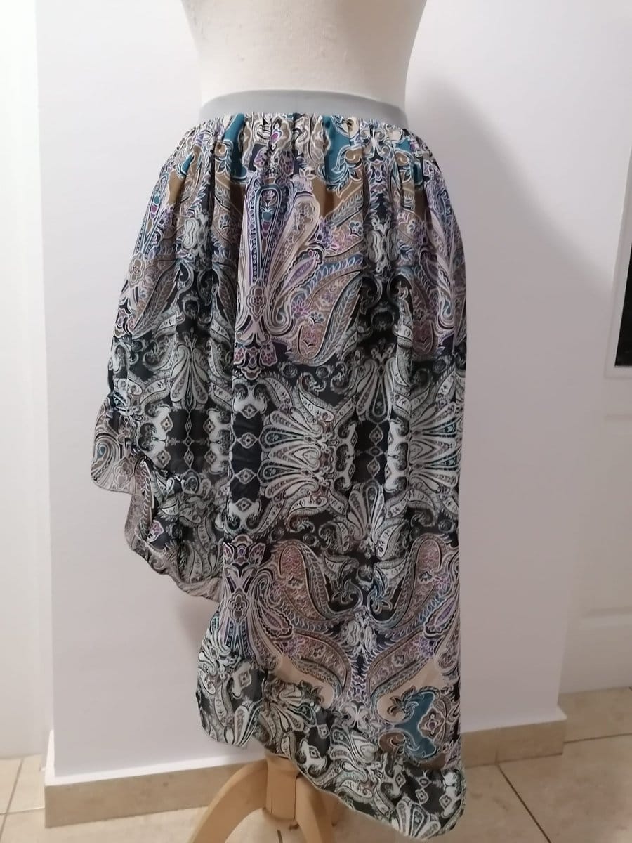 Fusta dama asimetrica Engros, cu imprimeu, volanase, elastic in talie