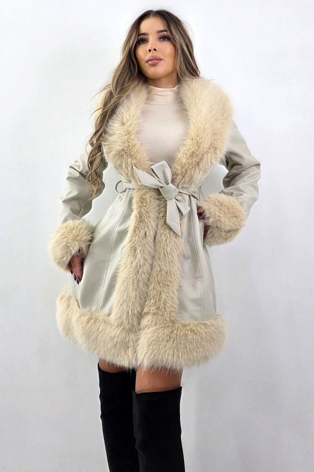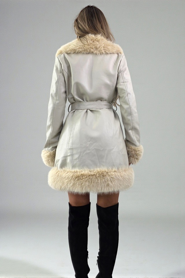 Geaca piele ecologica CARMELL, cu cordon si interior imblanit, Crem