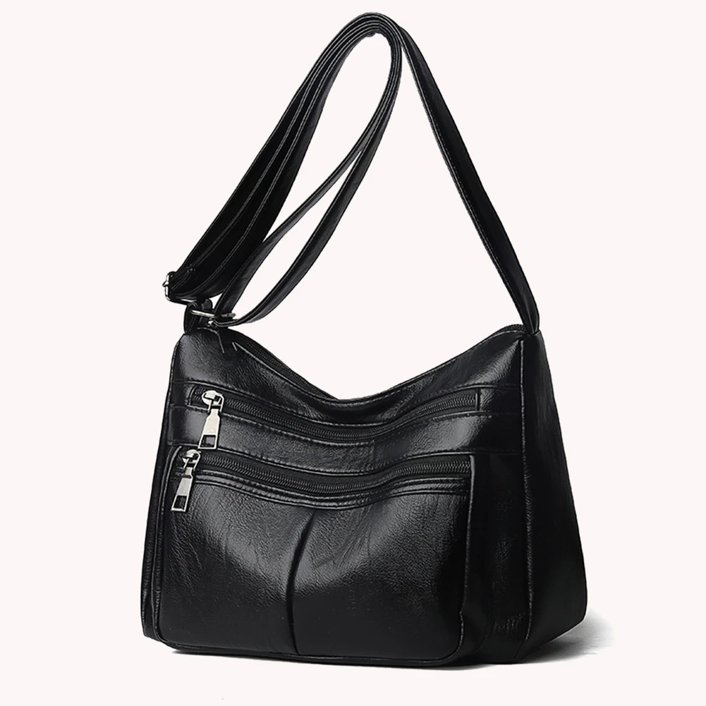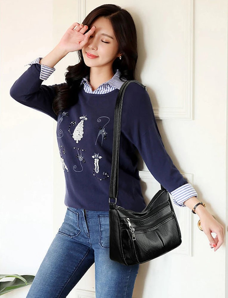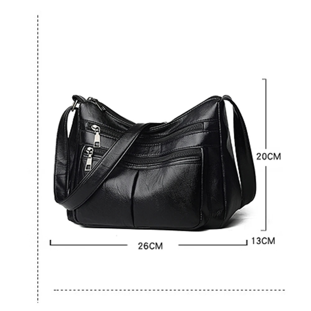 Detalii produs: 1 compartiment principal; 2 buzunare interioare fara inchidere; 1 buzunar exterior spate cu fermoar; 2 buzunare exterioare fata cu fermoar; 1 buzunar interior cu fermoar; material: piele ecologica; bareta ajustabila; dimensiuni: 26 x 13 x 20 cm. Important: Nuanta produsului poate varia usor, datorita luminozitatii monitorului, datorita varietatilor instrumentelor de masura, pot exista usoare erori de cm!