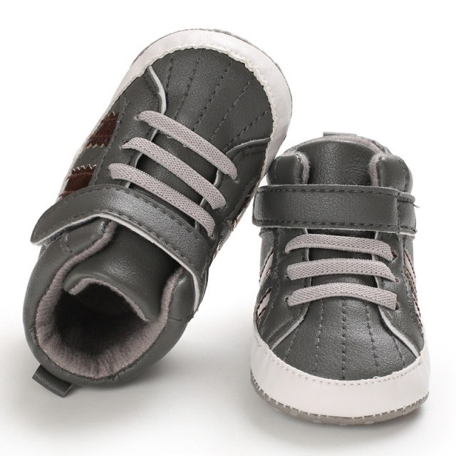 Marimi: 3 -6 luni ( lungime talpita la interior 10,5 cm, lungime talpita la exterior 11 cm) 6-9 luni ( lungime talpita la interior 11,6 cm, lungime talpita la exterior 12 cm) 9-12 luni (lungime talpita la interior 12,7 cm, lungime talpita la exterior 13 cm) Ghetute inalte pentru bebelusi din material tip piele ecologica, prevazuti cu dungi laterale maro, se inchid cu sireturi din elastic si bareta cu arici intr-o parte. Culoare: gri Talpa: material textil cu inscriptie antiderapanta