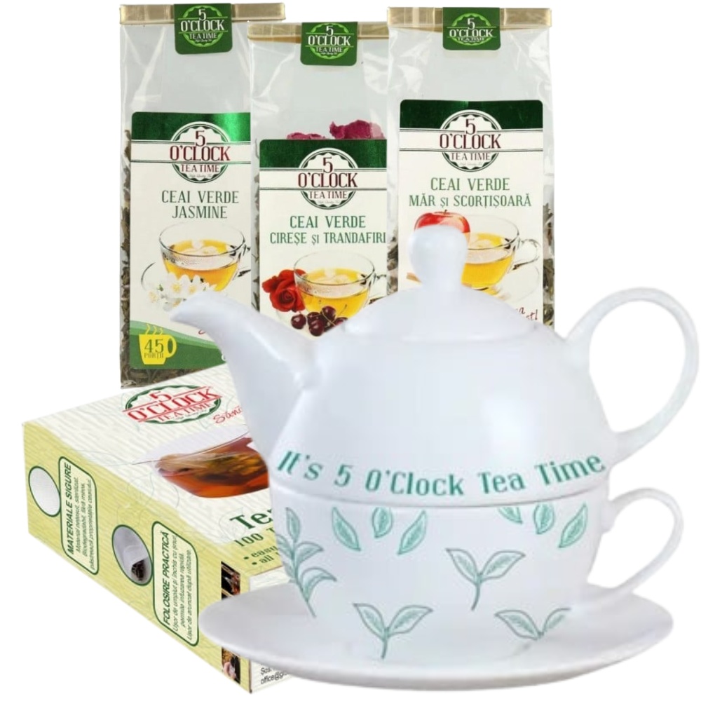 Green Tea Lover’s Kit este pachetul ideal pentru cei care iubesc finețea și prospețimea ceaiului verde. Fiecare sortiment din acest set a fost ales pentru a oferi o experiență completă — de la note florale de iasomie până la dulceața discretă a mărului și parfumul elegant al trandafirilor. Ce conține pachetul: Tea for One „It’s Tea Time” – set ceramic elegant (380 ml + 320 ml) 5 O’Clock Tea Ceai Verde Jasmine – 80 g 5 O’Clock Tea Ceai Verde cu Cireșe și Trandafiri – 80 g 5 O’Clock Tea Ceai Verde cu Măr și Scorțișoară – 80 g Filtre nețesute – 100 bucăți/cutie De ce îți va plăcea: O combinație echilibrată între ceaiuri verzi florale și ușor fructate, potrivite pentru orice moment al zilei. Setul Tea for One îți permite să prepari rapid și elegant o porție perfectă de ceai, păstrând aroma autentică a frunzelor. Filtrele incluse asigură o infuzie curată și clară, fără resturi în ceașcă. Este o alegere inspirată pentru un cadou elegant sau pentru propriul tău moment de relaxare. Recomandare de preparare: Folosește 1–2 g de ceai pentru 250 ml de apă la temperatura de 75–85°C. Lasă 2–3 minute la infuzat. Pentru o aromă mai intensă, poți re-infuziona frunzele o dată. Un set care aduce liniște, echilibru și prospețime – exact esența unui ceai verde de calitate.
