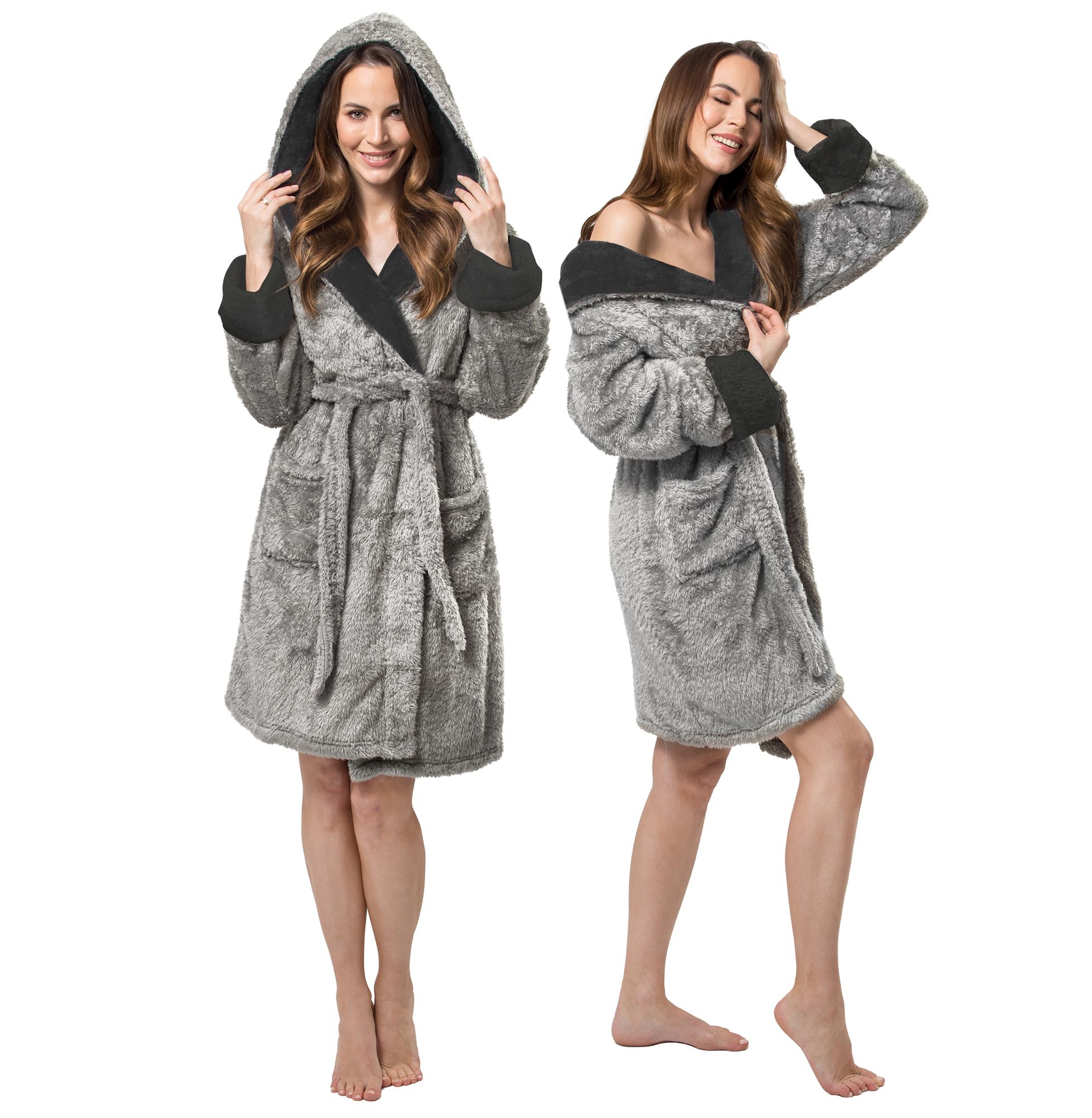 Un halat de baie moale și pufos. Însoțitorul perfect pentru diminețile răcoroase și serile lungi. Gluga spațioasă și lungimea genunchilor o fac perfectă pentru toamnă și iarnă. Cordon atașat halatului vă permite să-i reglați lățimea.