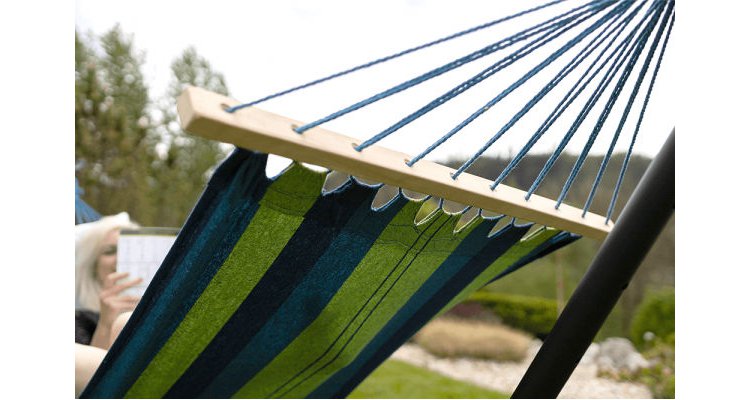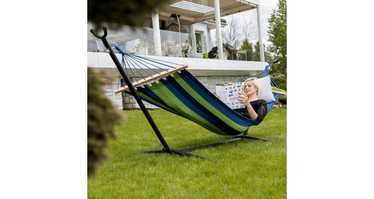 Hamac de balansare EVANA Material: bumbac/lemn/poliester Dimensiuni (LxL): 80x200 cmCuloare: turcoaz/albastru/verde Capacitatea de greutate: 120 kg Livrat fara suport Suportul poate fi comandat separat