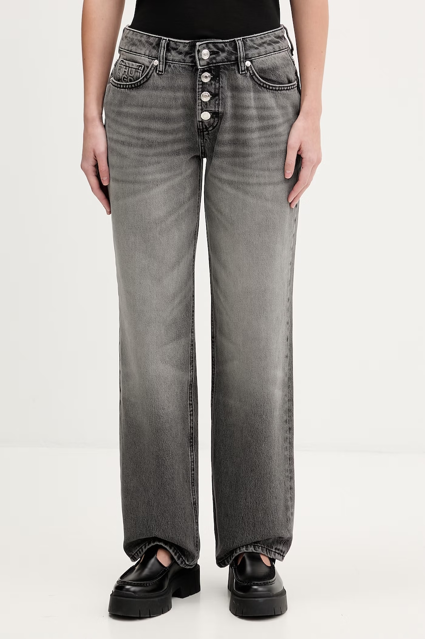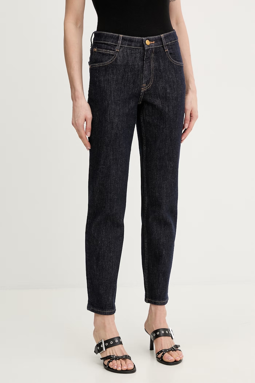 - Blugi strânși în jurul șoldurilor. - Model cu talie obisnuita si inchidere cu nasture si fermoar. - Piciorul pe lungime completă subliniază linia naturală a figurii. - Trei buzunare antiderapante în față. - Două buzunare antiderapante pe fese. - Latimea in talie: 45 cm. - Latimea in solduri: 52 cm. - Inaltimea taliei: 28 cm. - Latimea in partea de jos: 17 cm. - Latimea piciorului: 30 cm. - Lungimea exterioară a piciorului: 104 cm. - Dimensiunile date pentru marimea: 31/32.